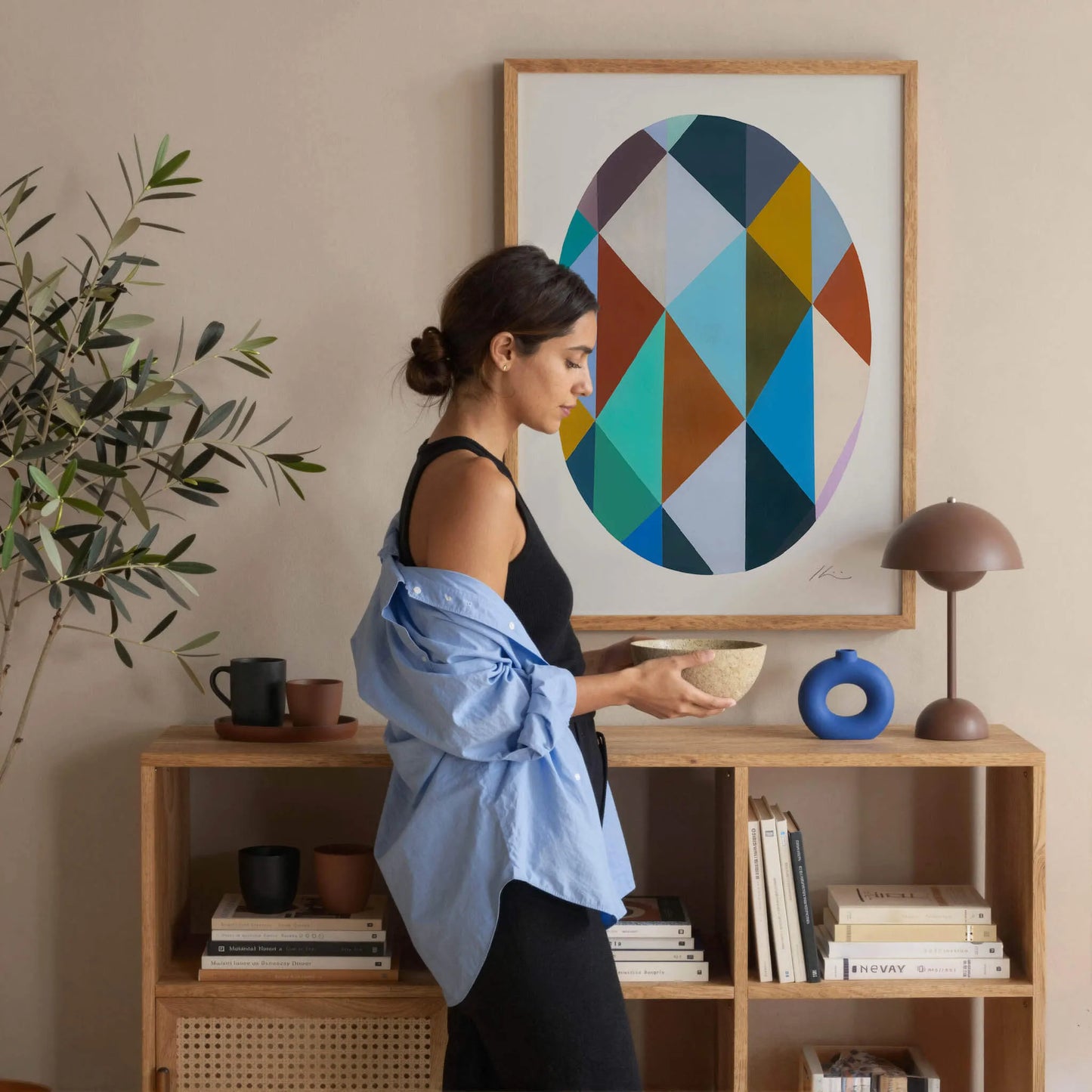 Rooted in Bauhaus ideals, Juana Gaviria’s work celebrates the power of form and colour to create art that is both functional and visually engaging. In Harlequin Egg II, contrasting shapes and tones interact to generate a strong sense of movement and depth. By exploring the relationship between shaped surfaces, embedded planes and surrounding space, Gaviria creates a clever and surprising visual experience. Harlequin Egg II by Juana Gaviria is a geometric art print perfectly suited to larger wall spaces, offering a playful yet restful focal point for contemporary interiors.