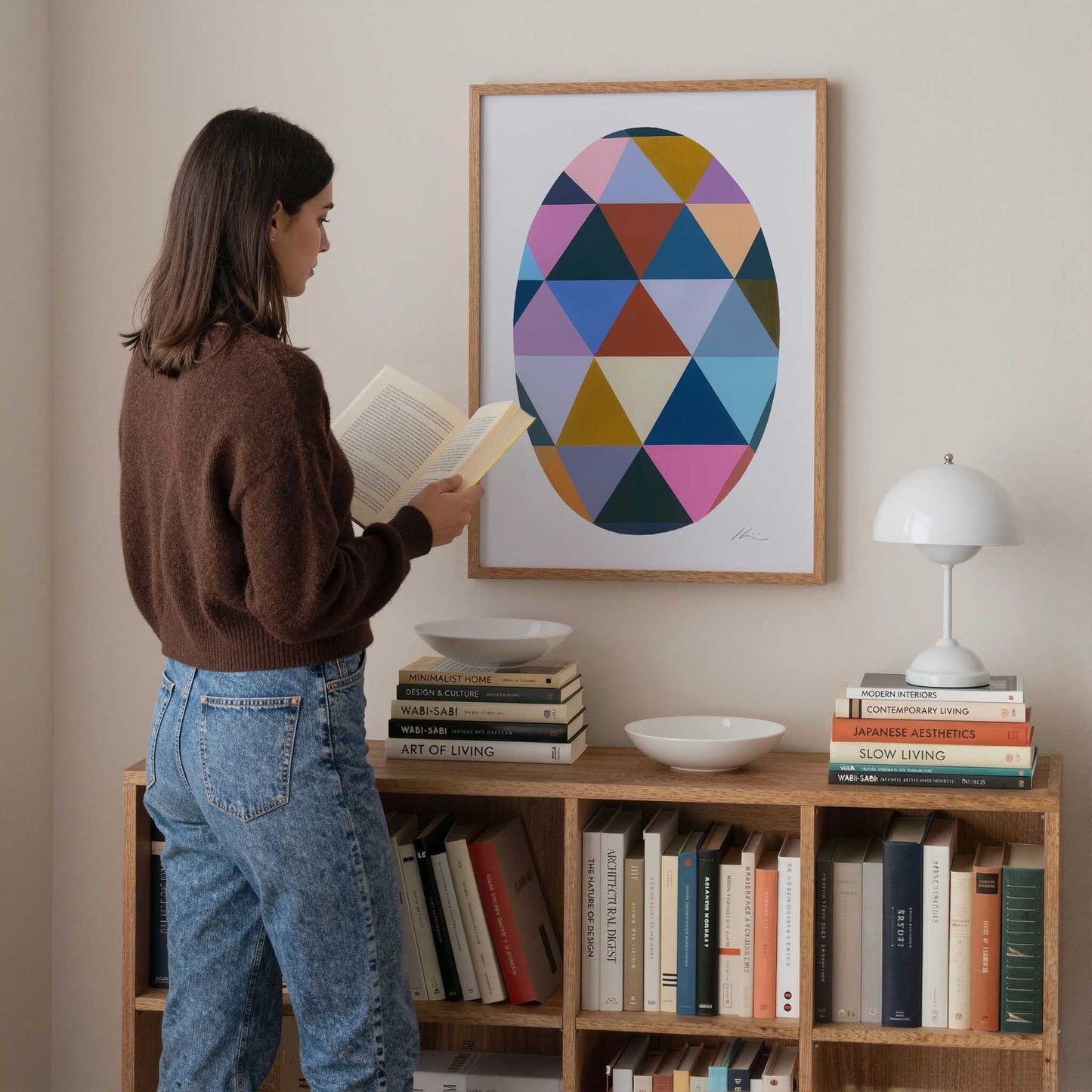 Sister print to Harlequin Egg II, this abstract art print by Colombian artist Juana Gaviria is joyful and stylish. Comprising colourful triangles in a warm palette of predominantly pinks, browns and purples, this bold design is one of a kind.
