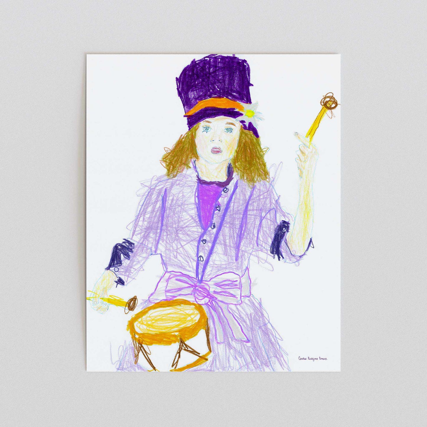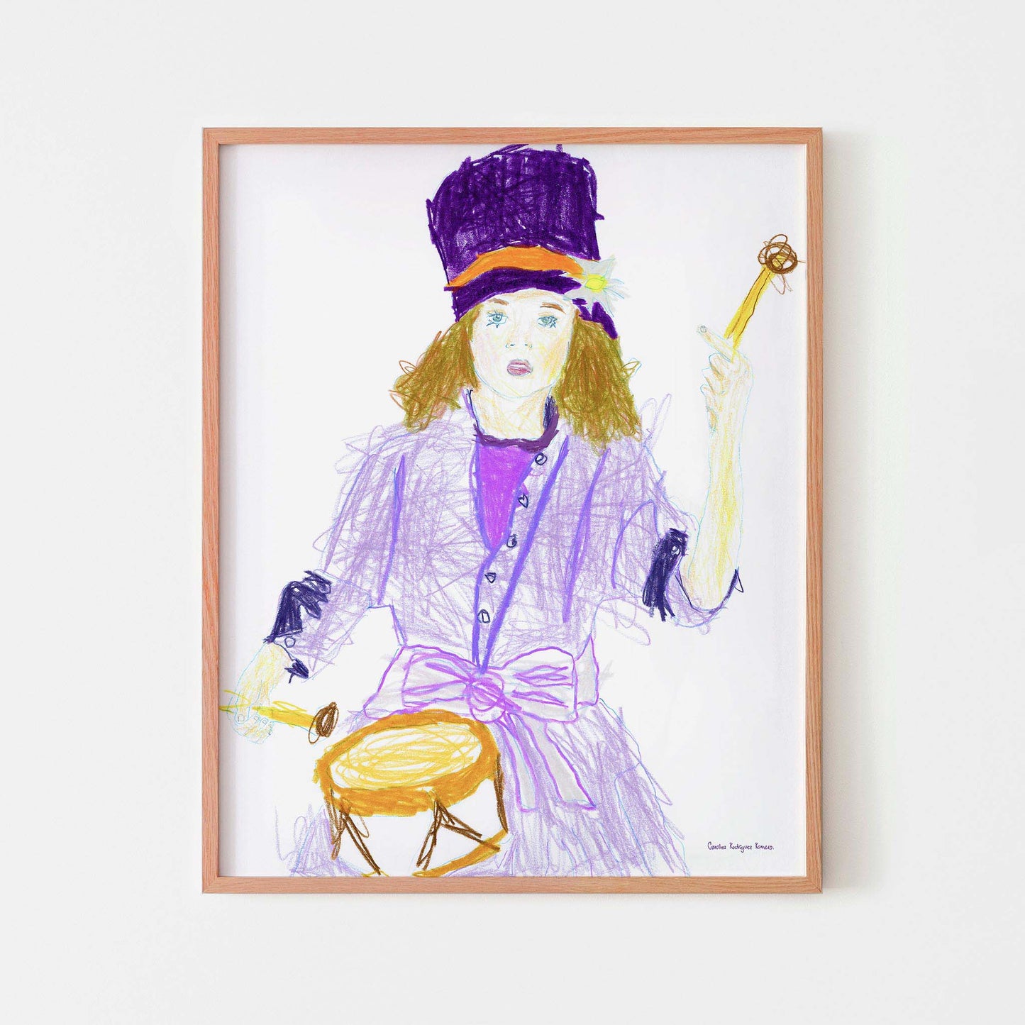 Modern wall art print portrait of a girl playing a drum framed in white.