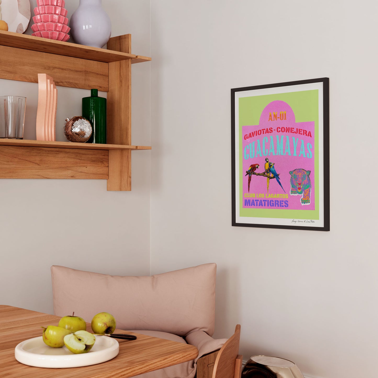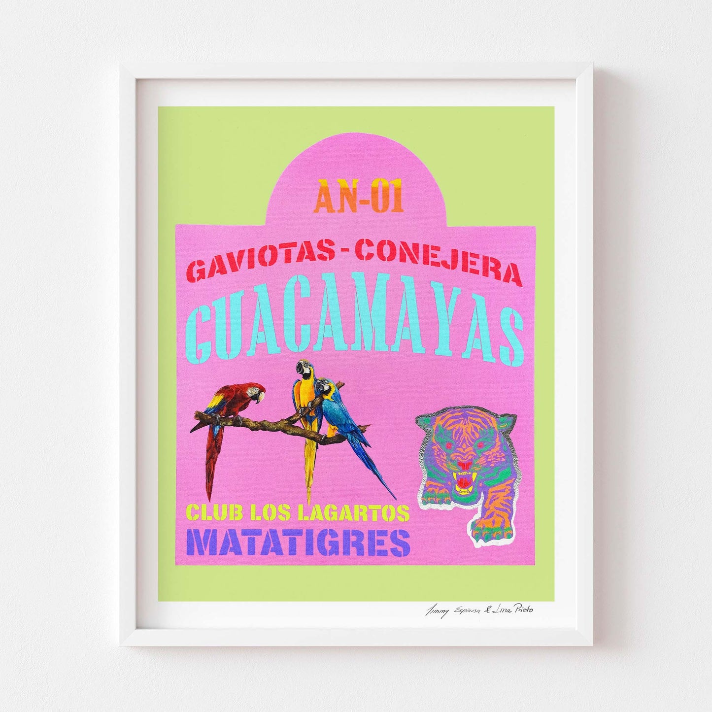 Bold and bright, the pink art print Guacamayas by J&L Constructores is inspired by the signage that indicates Colombia's bus routes. Hand-painted signs are a celebrated feature of Latino popular culture and Jimmy and Lina pay homage to this in their clever and creative adaptations that make up the series Trayectos.