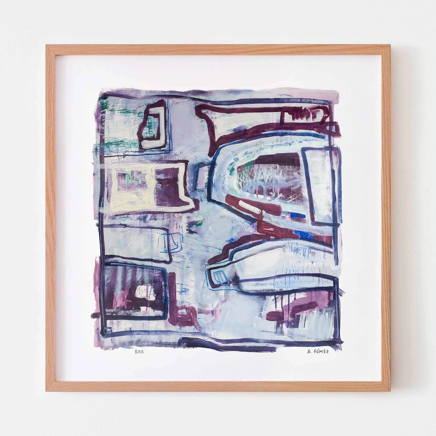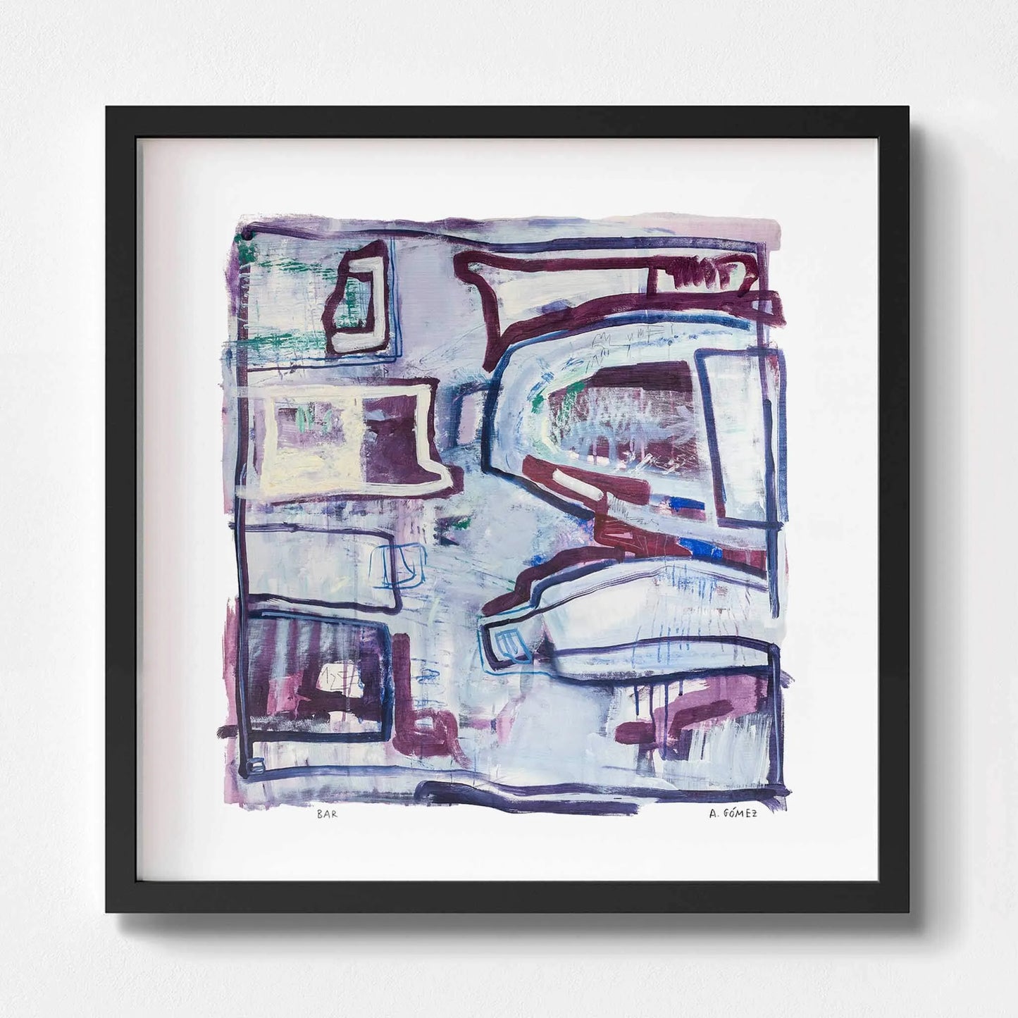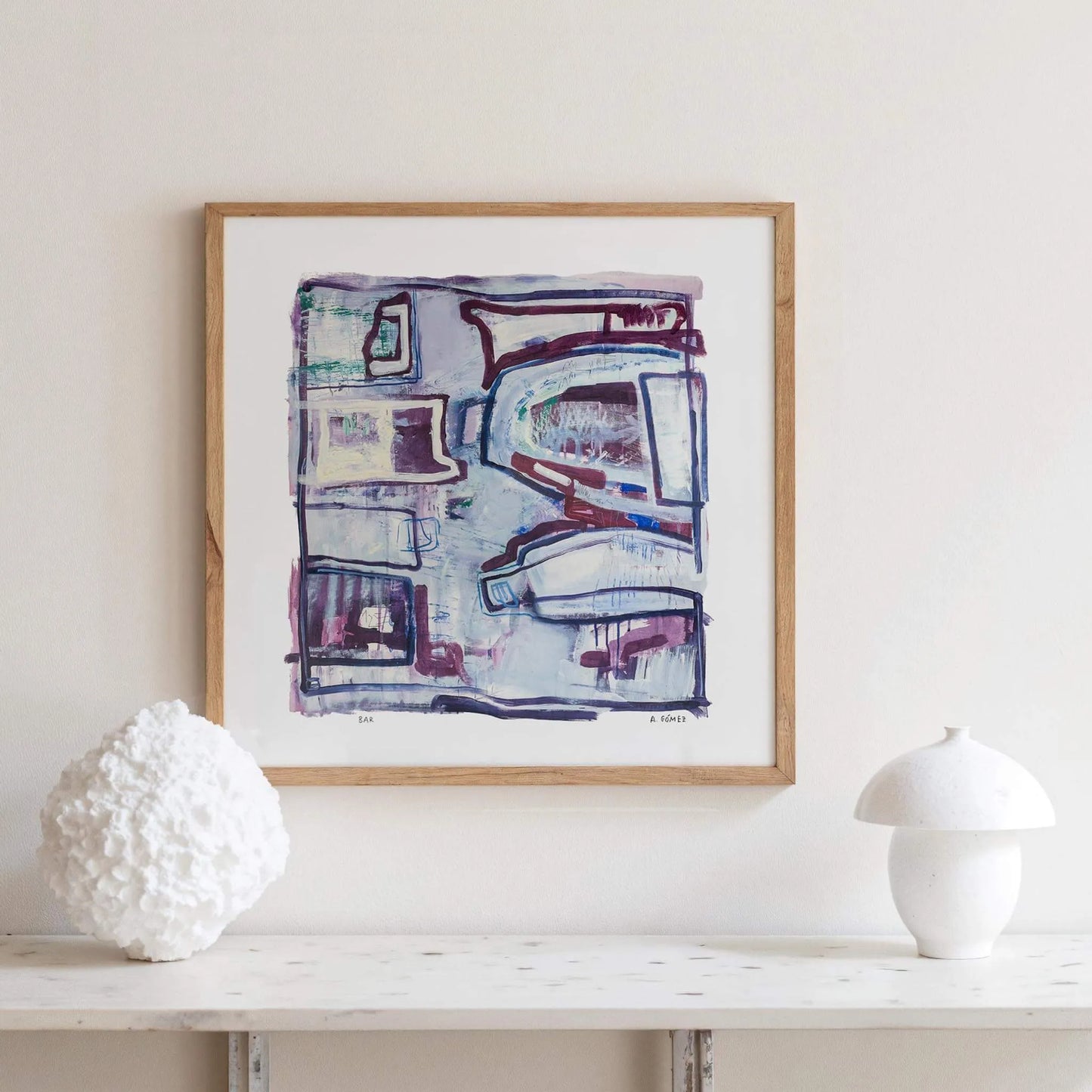 Framed abstract artwork with expressive lines and shapes on a white background.