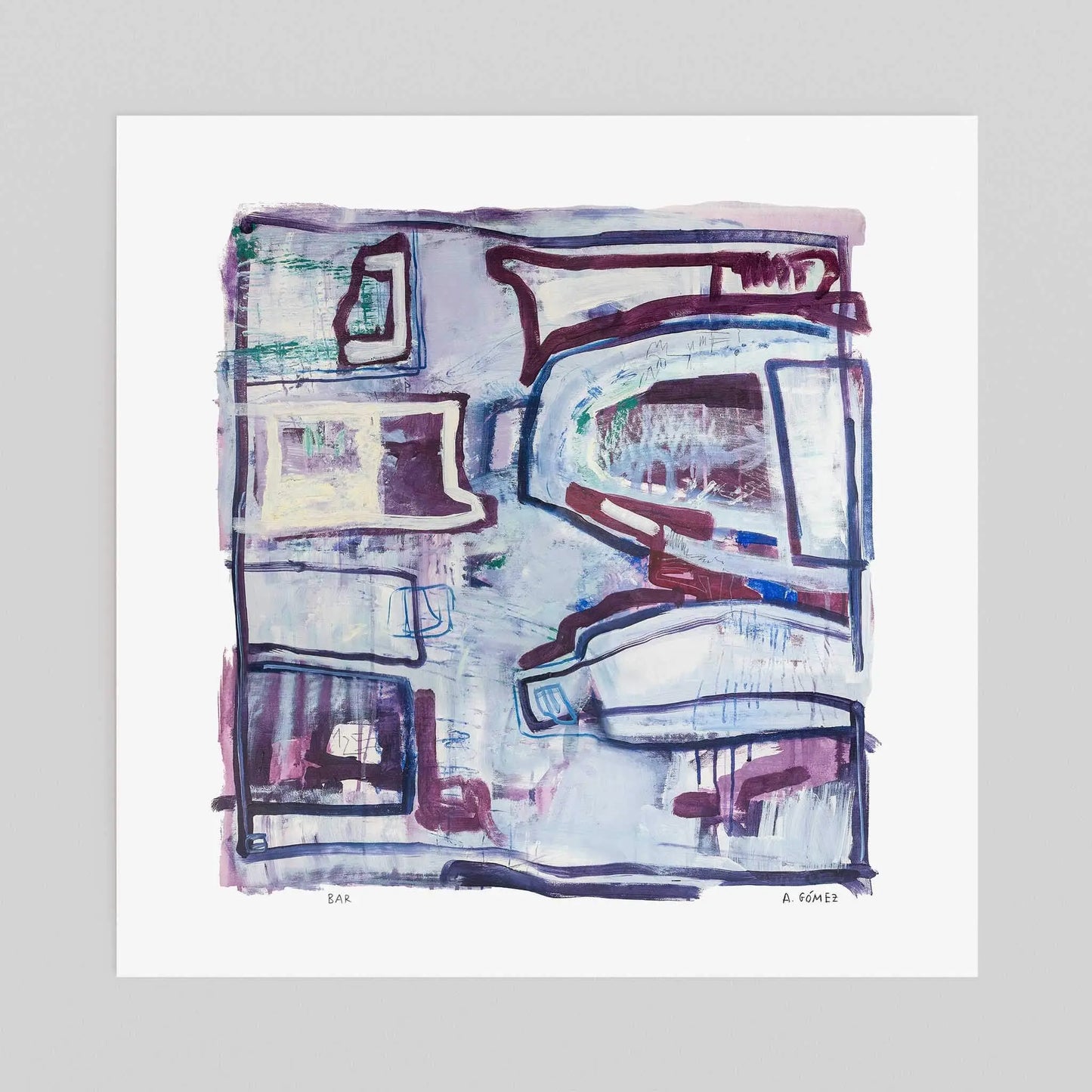 Abstract artwork with expressive shapes and minimal colors on a white background.