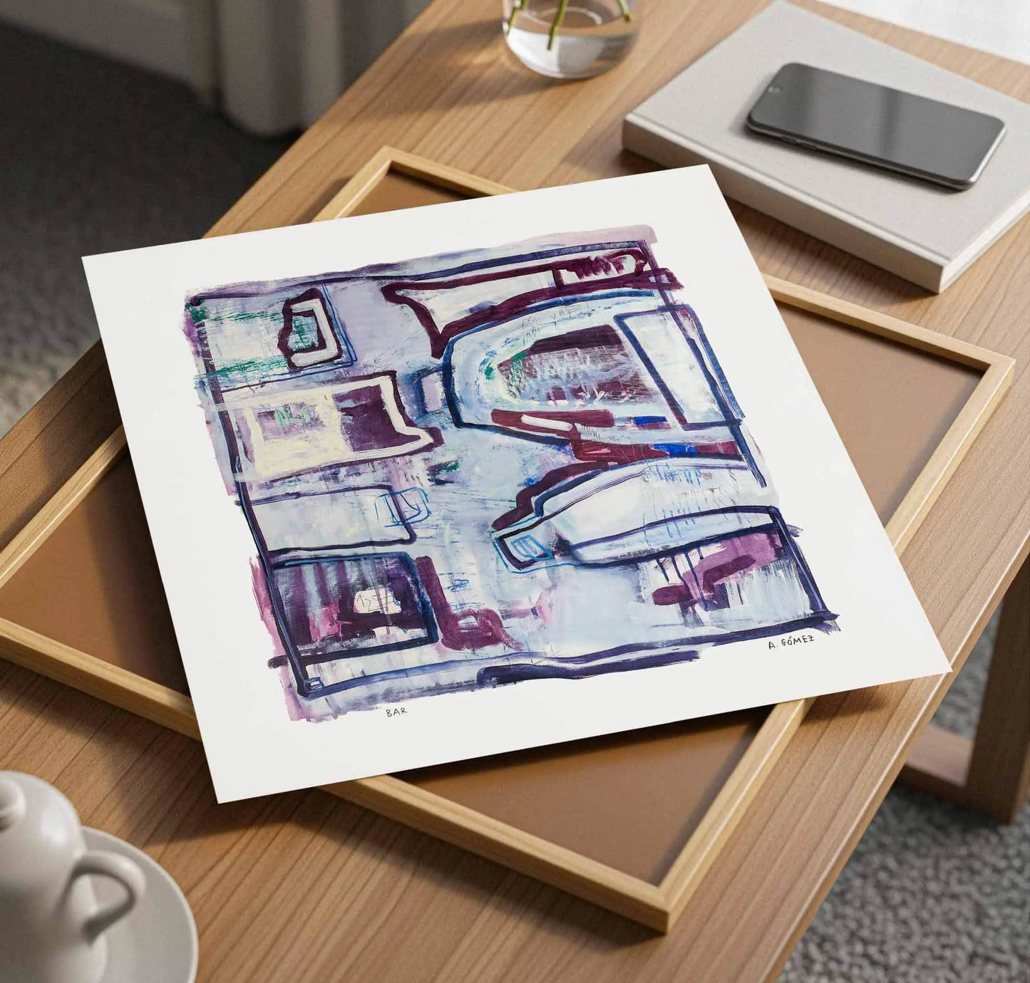 Abstract painting on a wooden table with a phone, book and vase in the background.