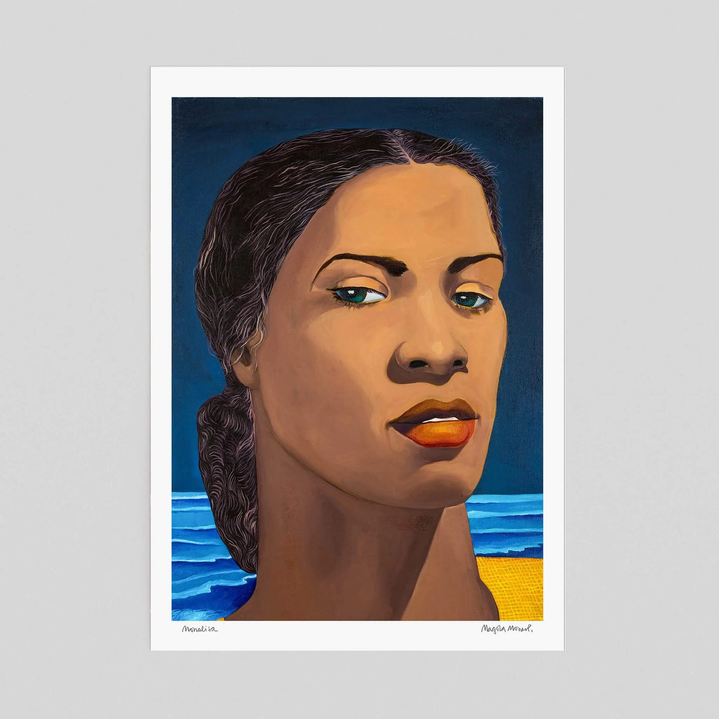 Magola Moreno’s work is defined by an introspective approach that questions personal perspective while gently challenging conventional ideas of truth, beauty and validity. Her paintings exist in a fictional, imaginative realm, offering an alternative to the harshness of everyday realities. Rather than subverting tradition outright, Moreno embraces her limitations, using them as a framework to develop her own visual language. The result is a quietly defiant, deeply human portrait that feels both timeless and contemporary, making Mona Lisa a truly unique art print for thoughtful collectors.