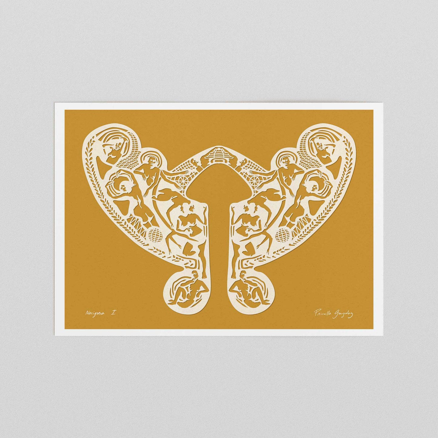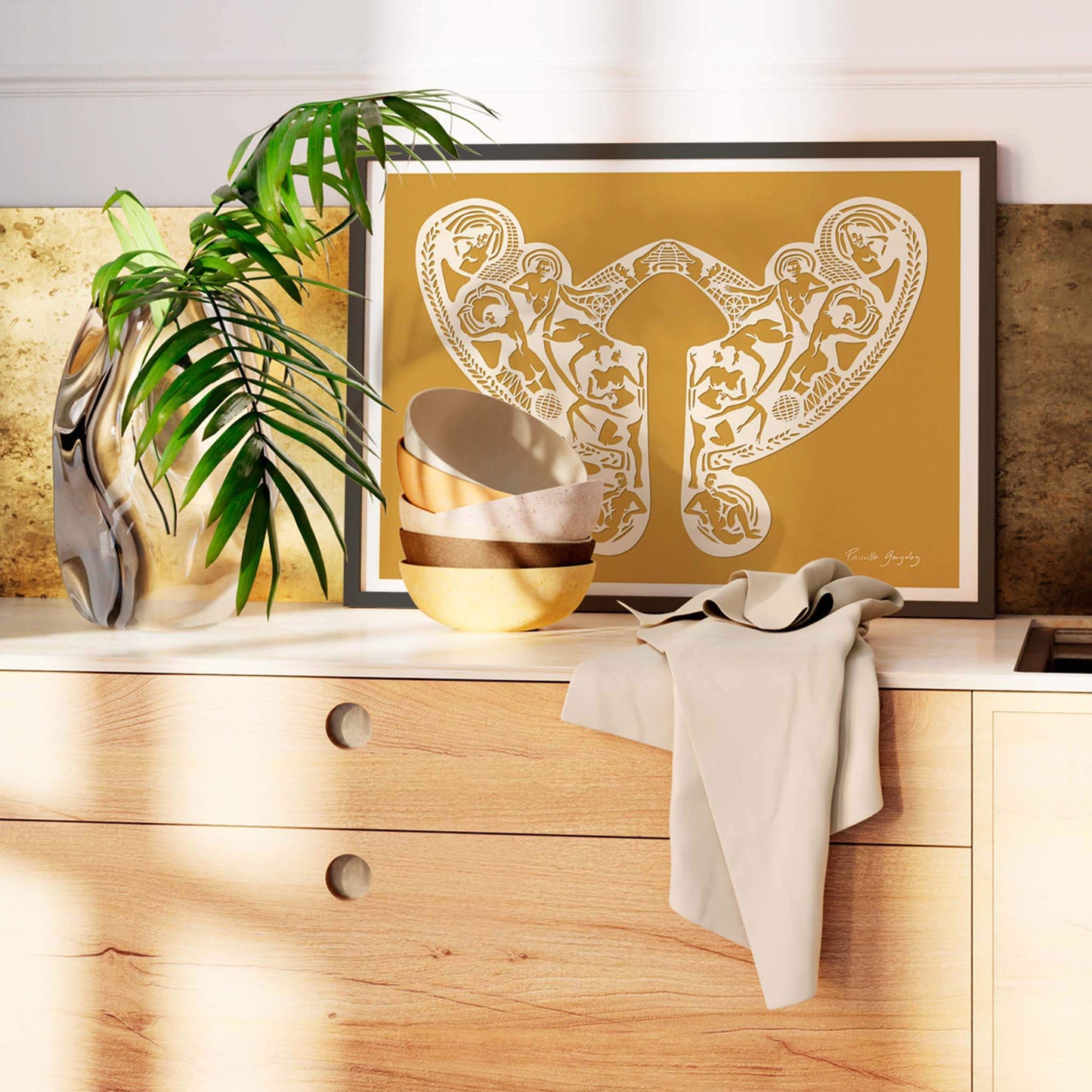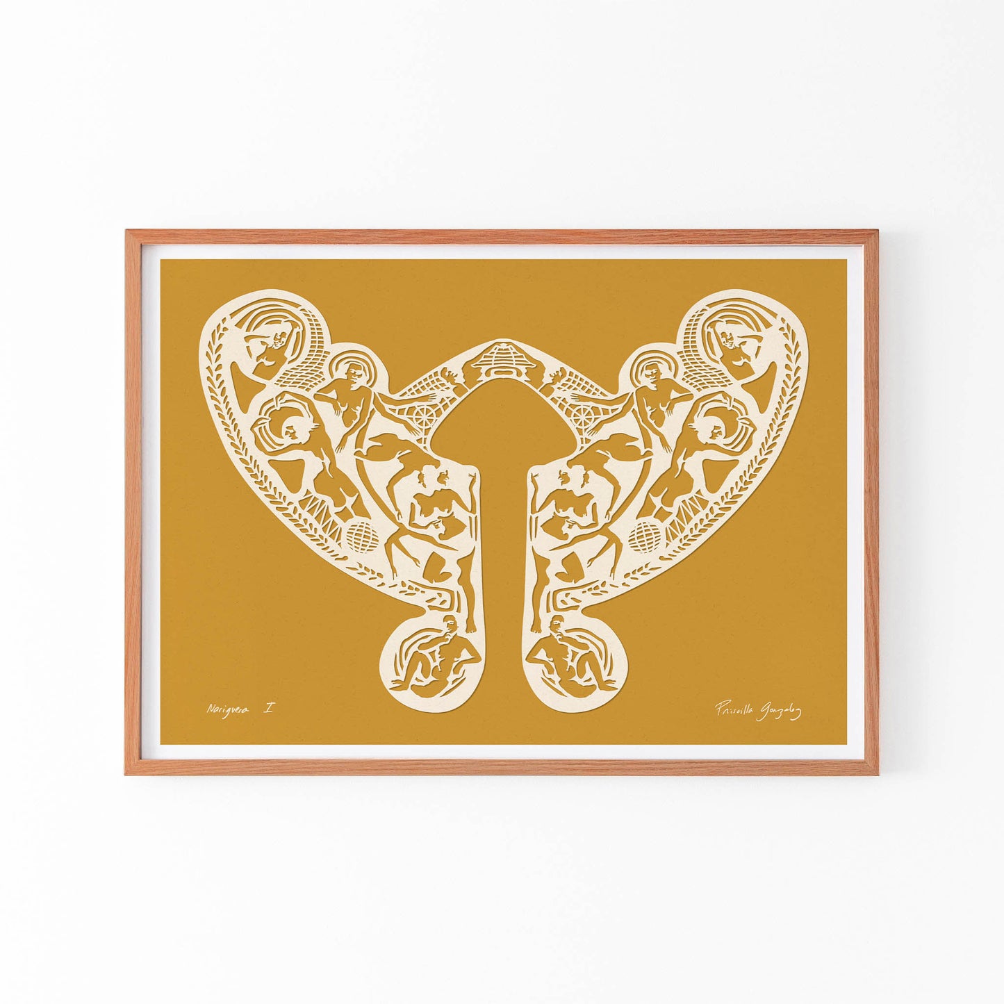 In the deep yellow art print Nariguera 1 by Costa Rican artist Priscilla González, the artist makes reference to Pre-columbian narigueras, a form of intricate nasal jewellery made from gold. Used by both men and women, it's believed narigueras were worn as a symbol of status and, research suggests, during wedding rituals.
