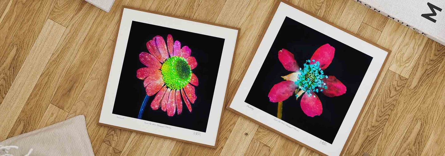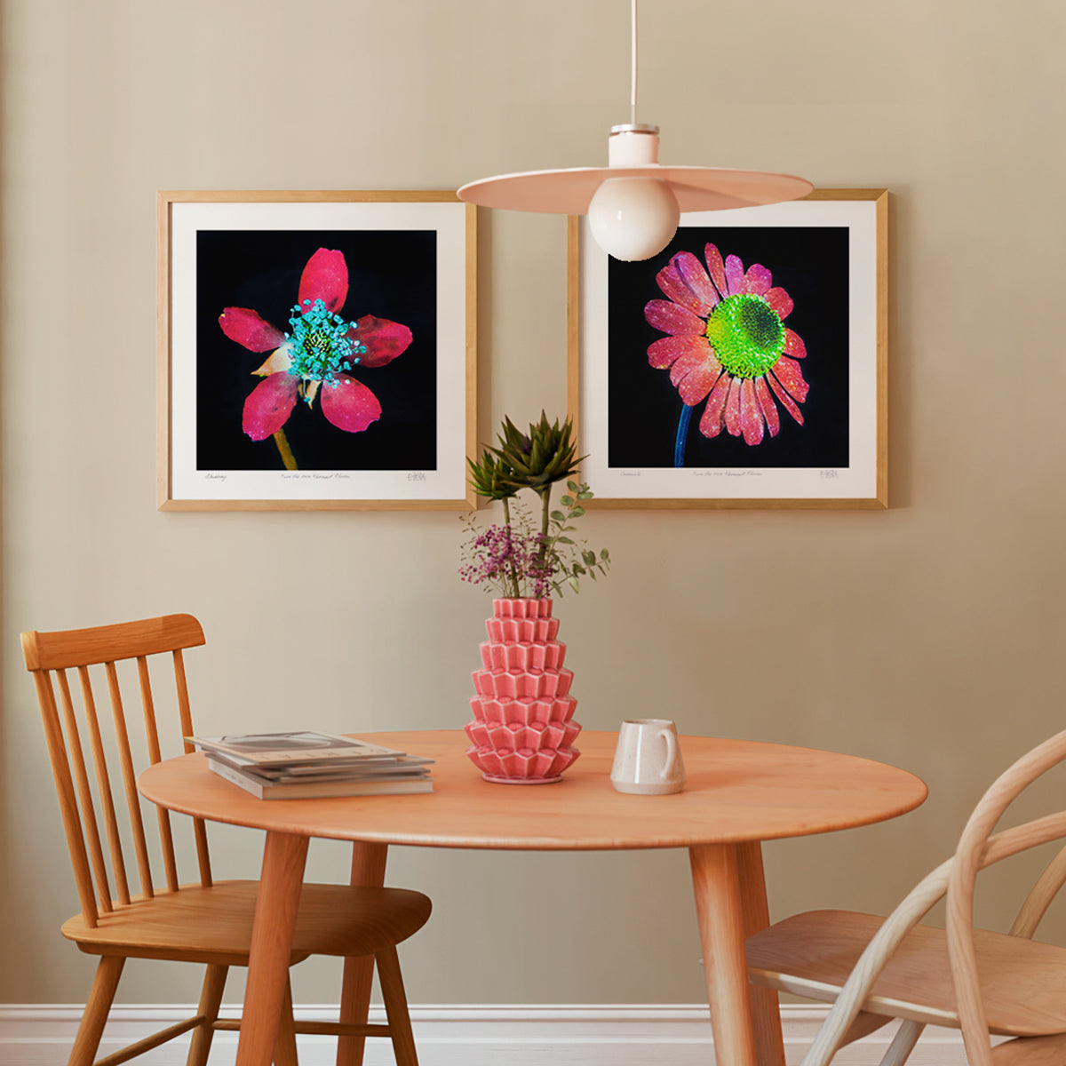 Esteban Peña's Pink Flowers prints are a floral pairing you won't find anywhere else. Electric pinks, blues and greens add a modern touch to a time-honoured subject, making these artworks perfect for the contemporary home.