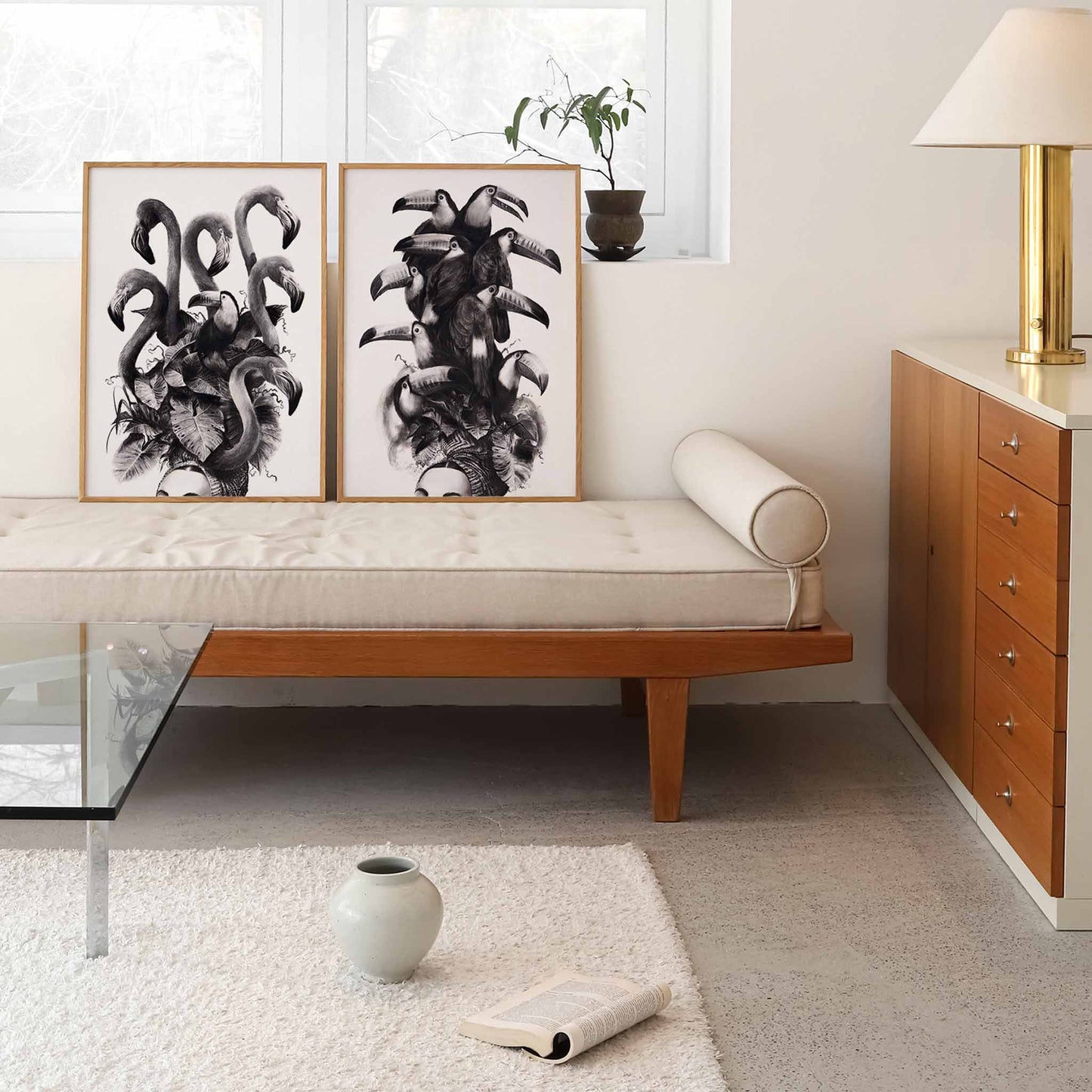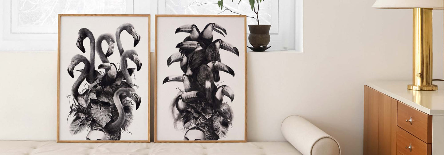 Certain to spark curiosity among guests, these art prints of toucan and flamingo headdresses infuse narratives of cultural representation from across the American continent with wit, charm and intrigue.