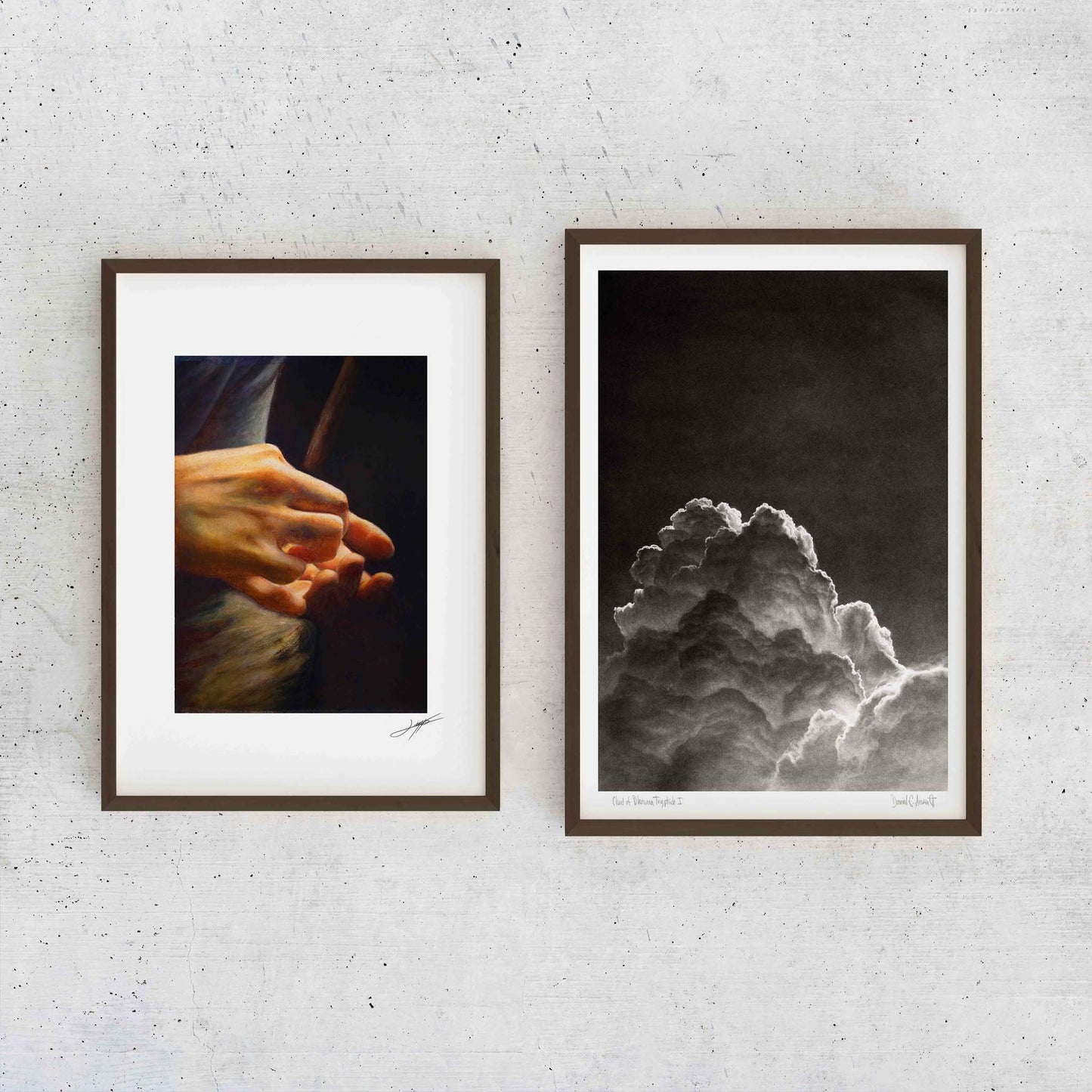 Two framed monochrome art prints on a textured wall, one depicting hands and the other a cloud.