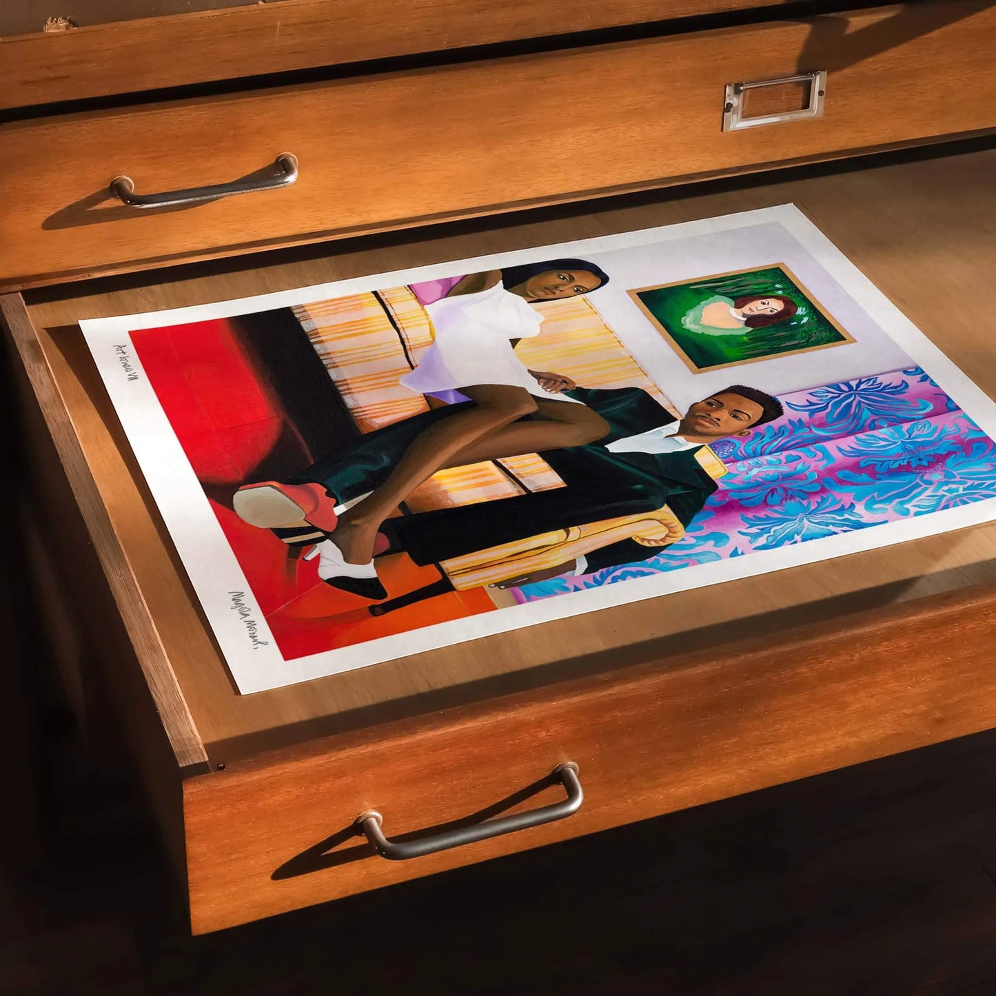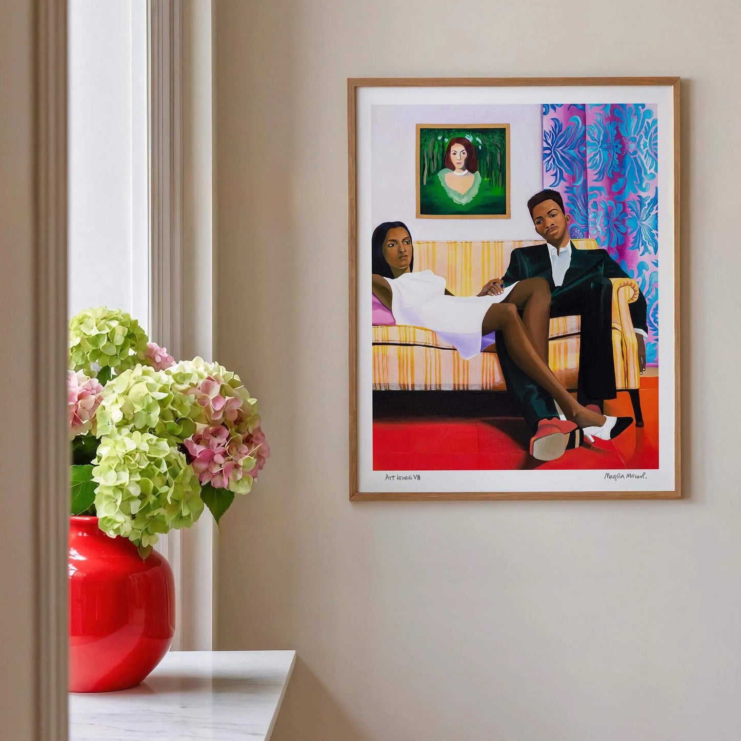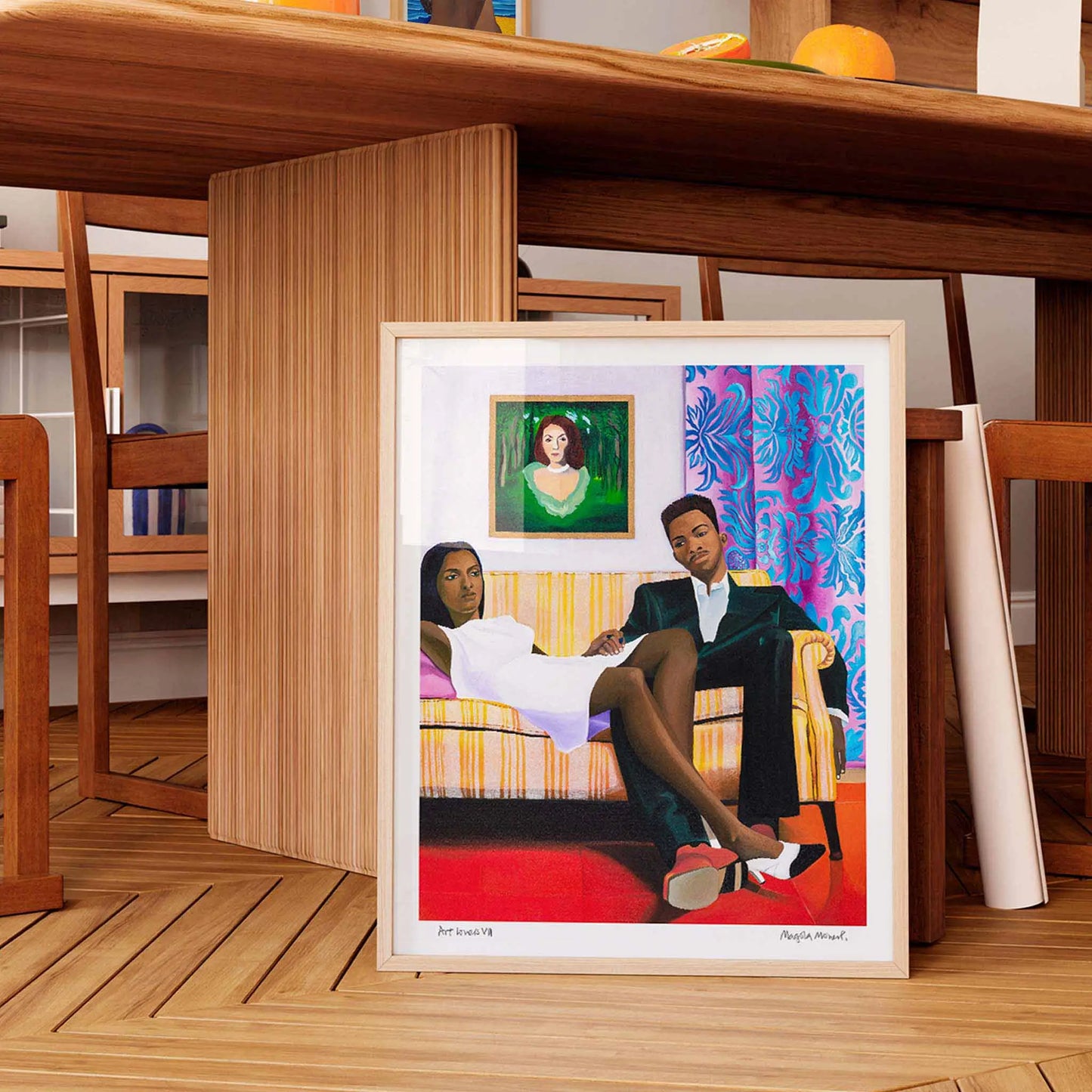 Beyond its narrative richness, Art Lovers VIII by Magola Moreno captivates with its use of colour, composition and intricate detail, revealing something new with each viewing. Ideal as a bold focal point in the home, this unique art print transforms social spaces into eye-catching, conversation-starting environments. Moreno’s work is imaginative and deeply personal, questioning perspective while offering a fictional, reflective world. With Art Lovers VIII, you gain a piece that is both visually striking and intellectually engaging. A modern statement artwork for collectors who value colour, storytelling and the power of contemporary art.