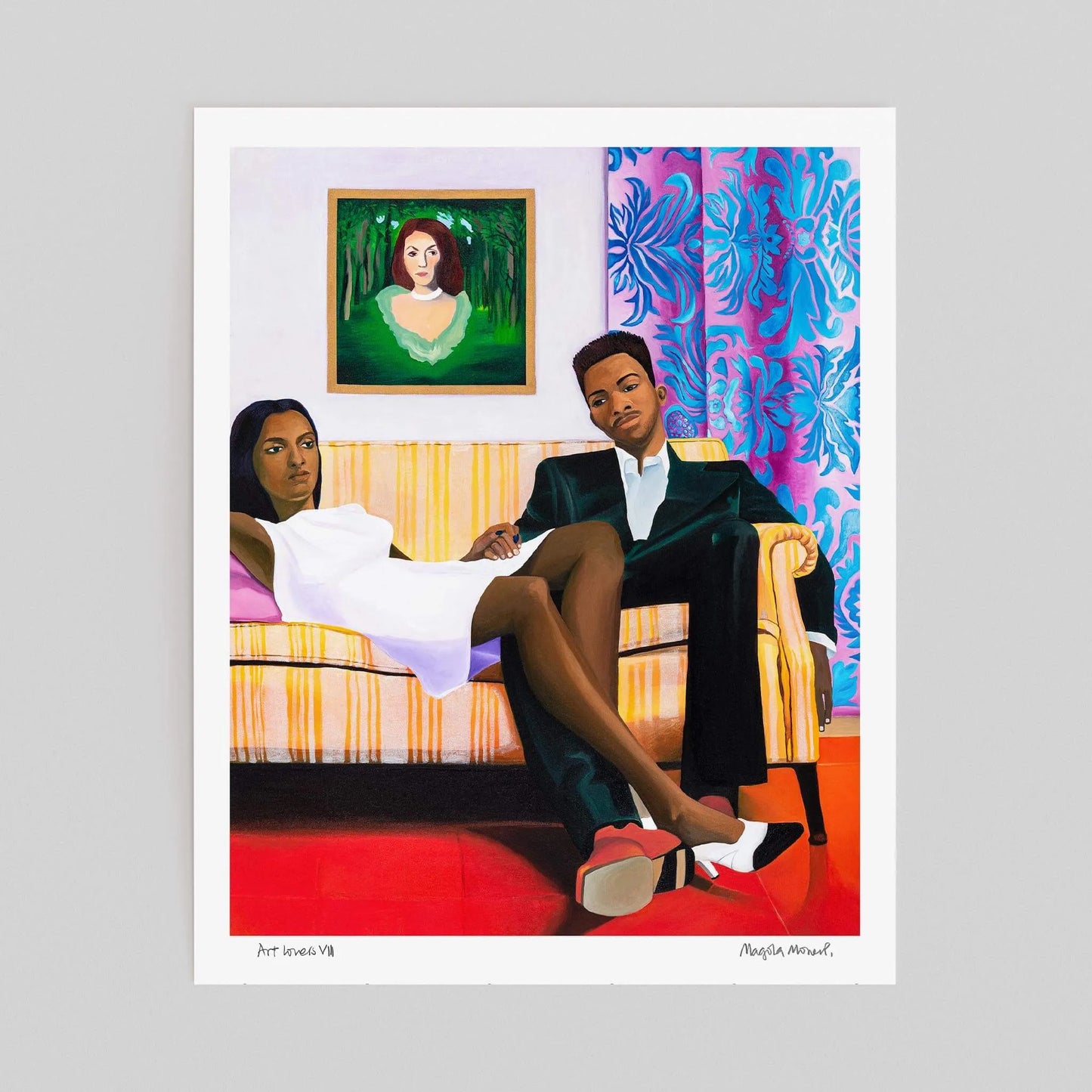 Art Lovers VIII by Magola Moreno is a vibrant and unique art print that blends art history, narrative depth and visual intrigue. Part of a series exploring artworks that inspire the artist, this piece references Cindy Sherman’s Society Portraits series, a 2008 project that examines the illusions of beauty, status and success upheld by the art world’s elite. Through this dialogue, Moreno reflects on human ambition, perception and the stories embedded in the art we admire.