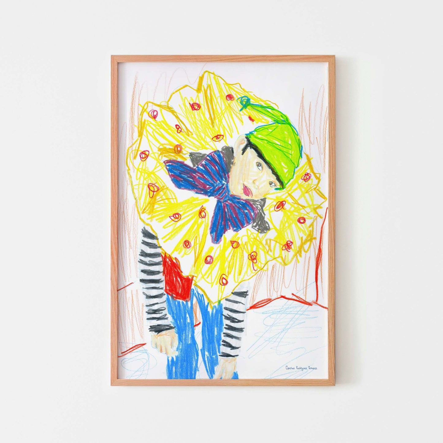 Modern wall art print of a boy in a clown costume framed in white.