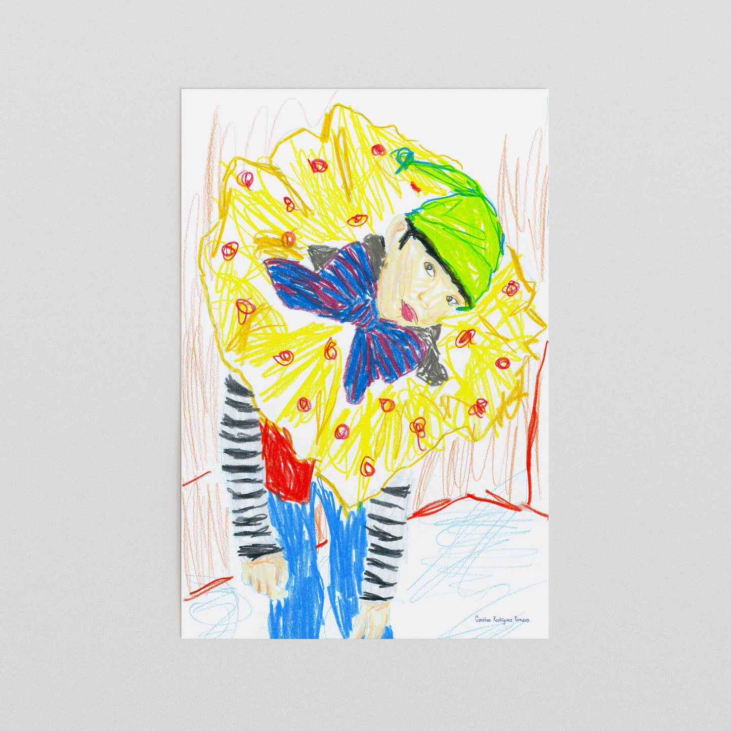 Unframed wall art print of a boy in a clown costume.