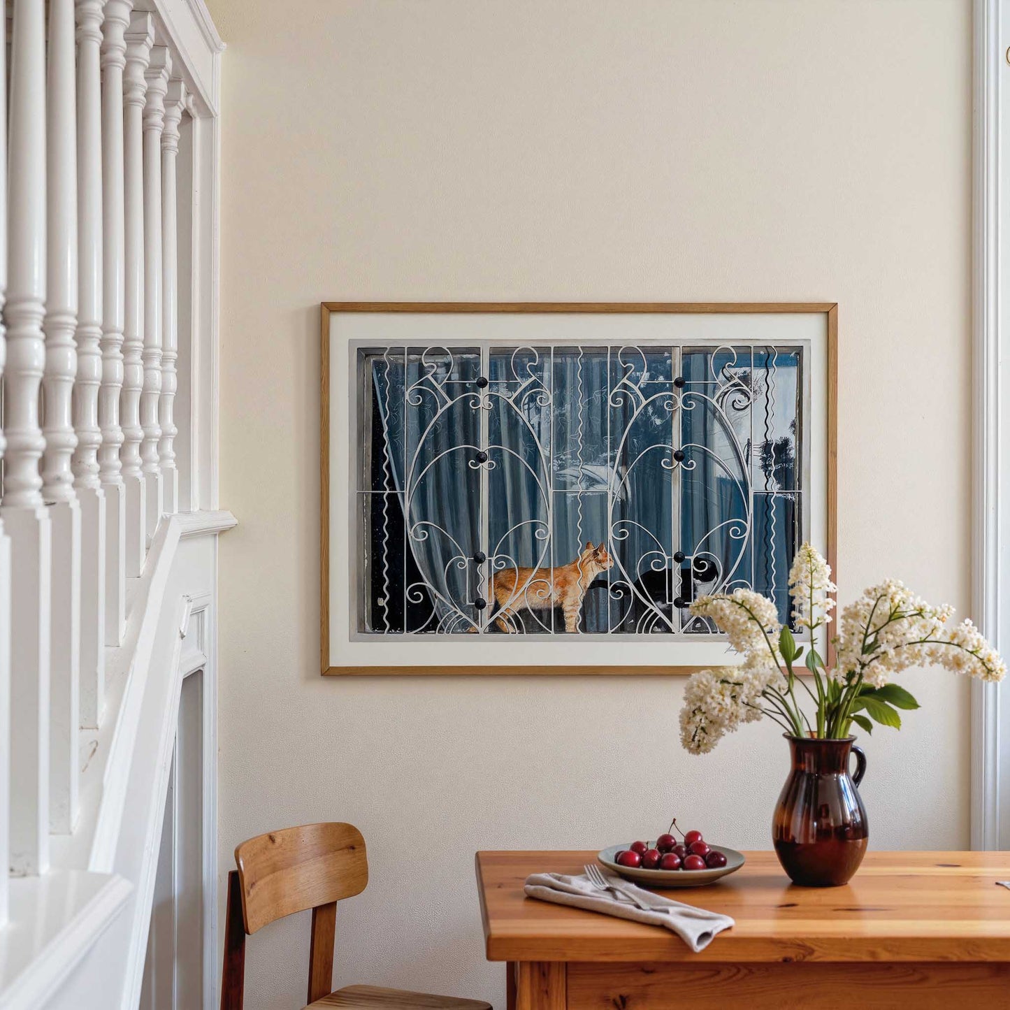 Framed artwork of two cats behind a window grille on a wall above a wooden table with a vase and fruit bowl.