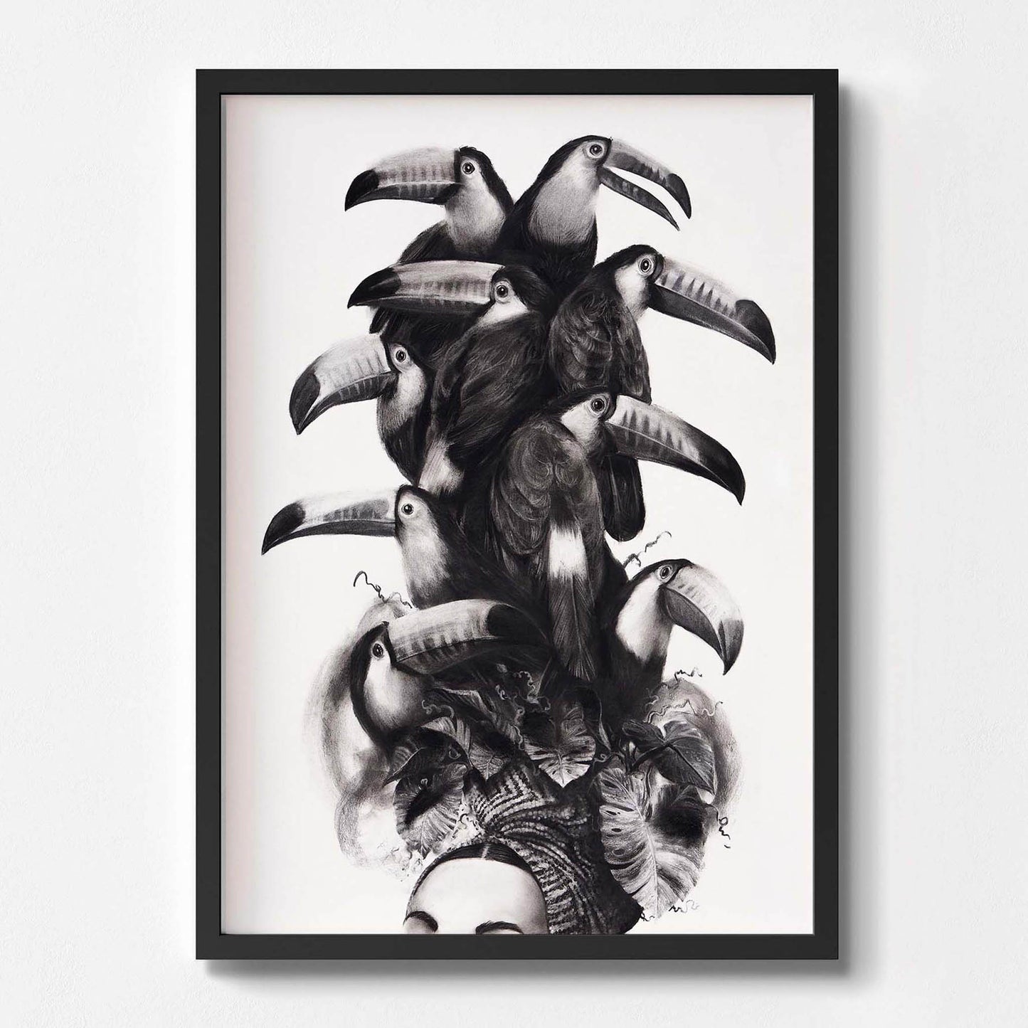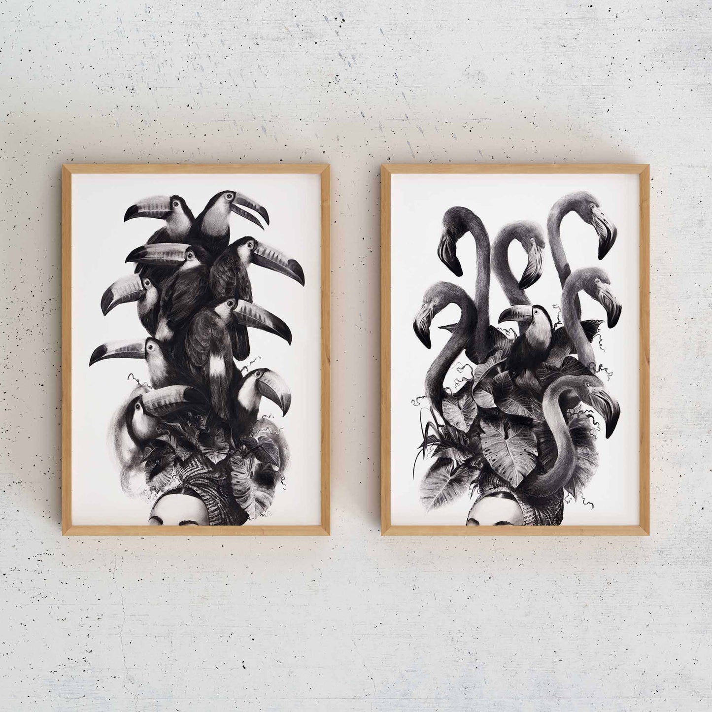 Bring a touch of Gonzalo Fuenmayor's iconic imagery into your home with his Carmen Tropical print pair. Certain to spark curiosity among your visitors, these art prints of toucan and flamingo headdresses infuse narratives of cultural representation from across the American continent with wit, charm and intrigue.