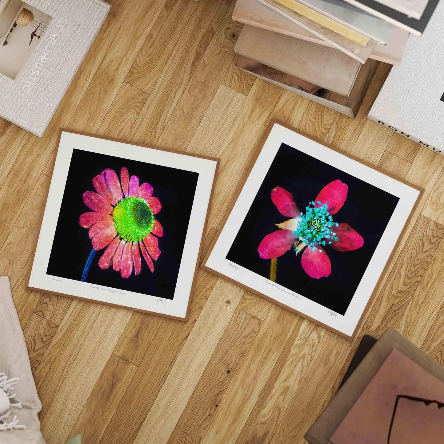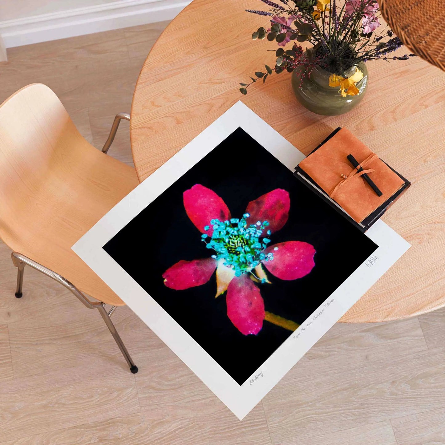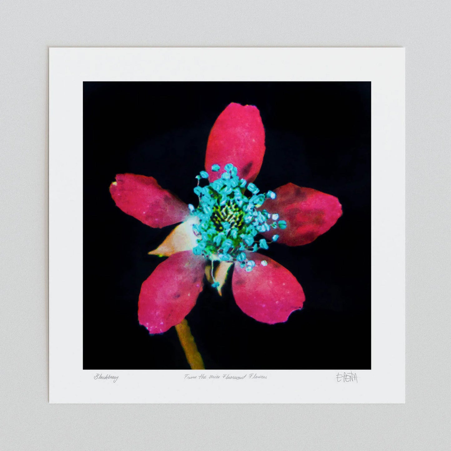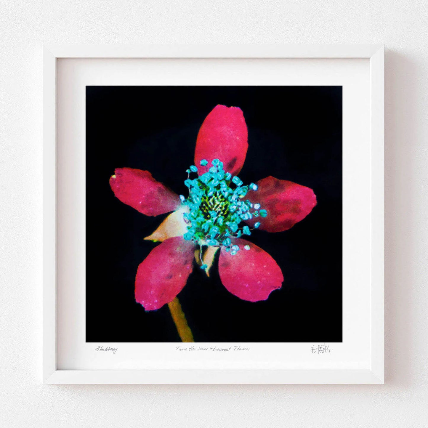 Blackberry by Esteban Peña is a striking floral art print from the artist’s Fluorescent Flowers series, which offers a bold new way to experience nature. Inspired by how insects see the world, this artwork reimagines the blackberry flower through ultraviolet and infrared vision, transforming it into a vivid, electric burst of colour. To pollinators, flowers appear like glowing neon signals, guiding them toward nectar and pollen, and this print captures that hidden visual language beautifully.