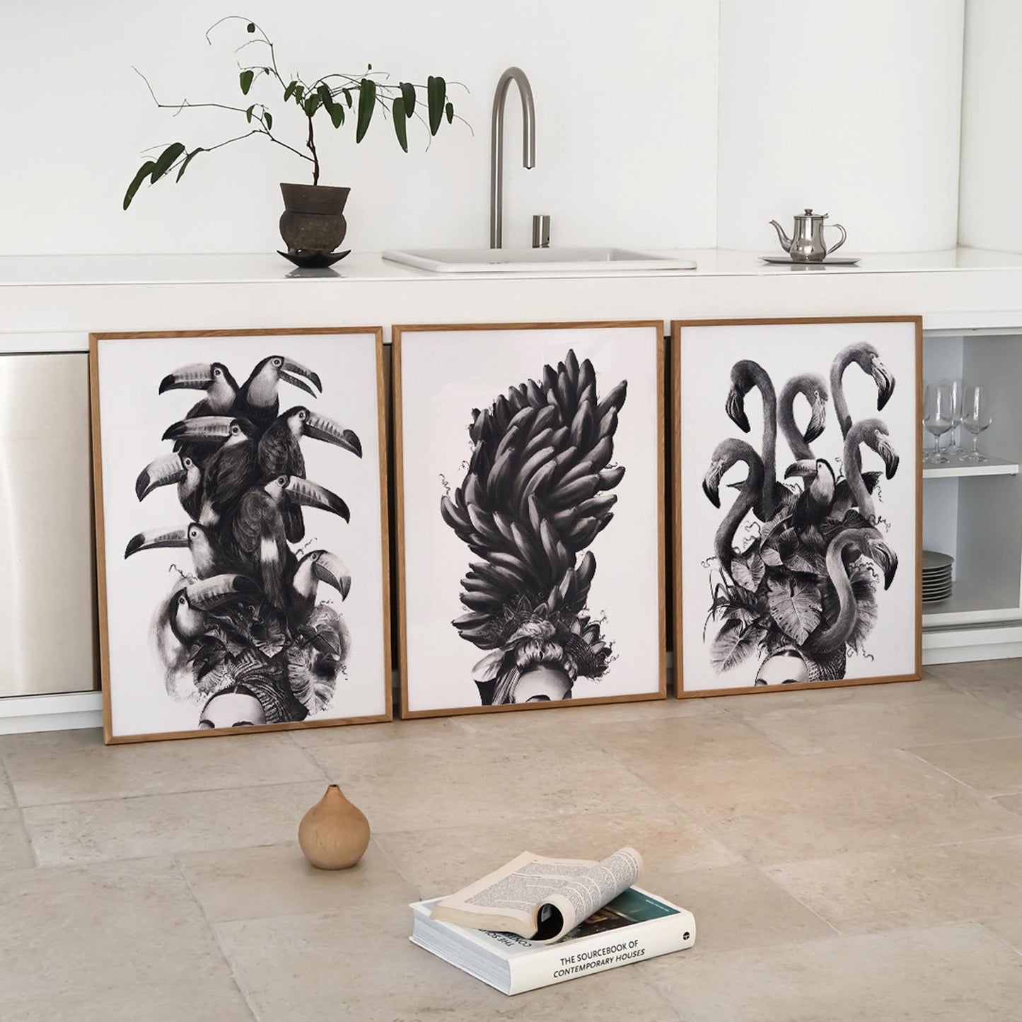 Bring a touch of Gonzalo Fuenmayor's iconic imagery into your home with his Carmen Tropical Trio. Certain to spark curiosity among your visitors, these art prints of toucan, flamingo and banana headdresses infuse narratives of cultural representation from across the American continent with wit, charm and intrigue.