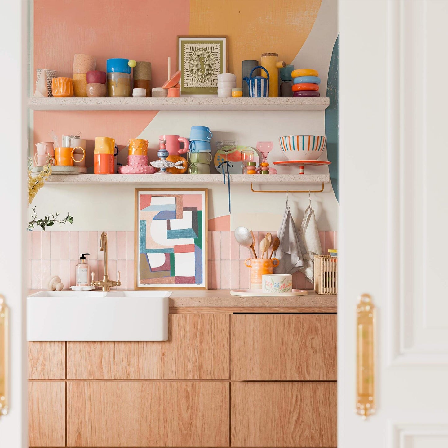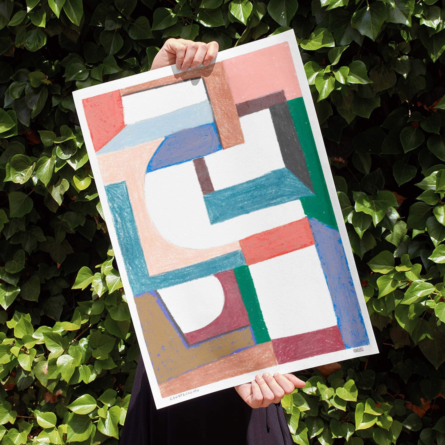 Blues, pinks and soft browns come together in Construcción through layered shapes and forms, creating wall art that's gentle but arresting.