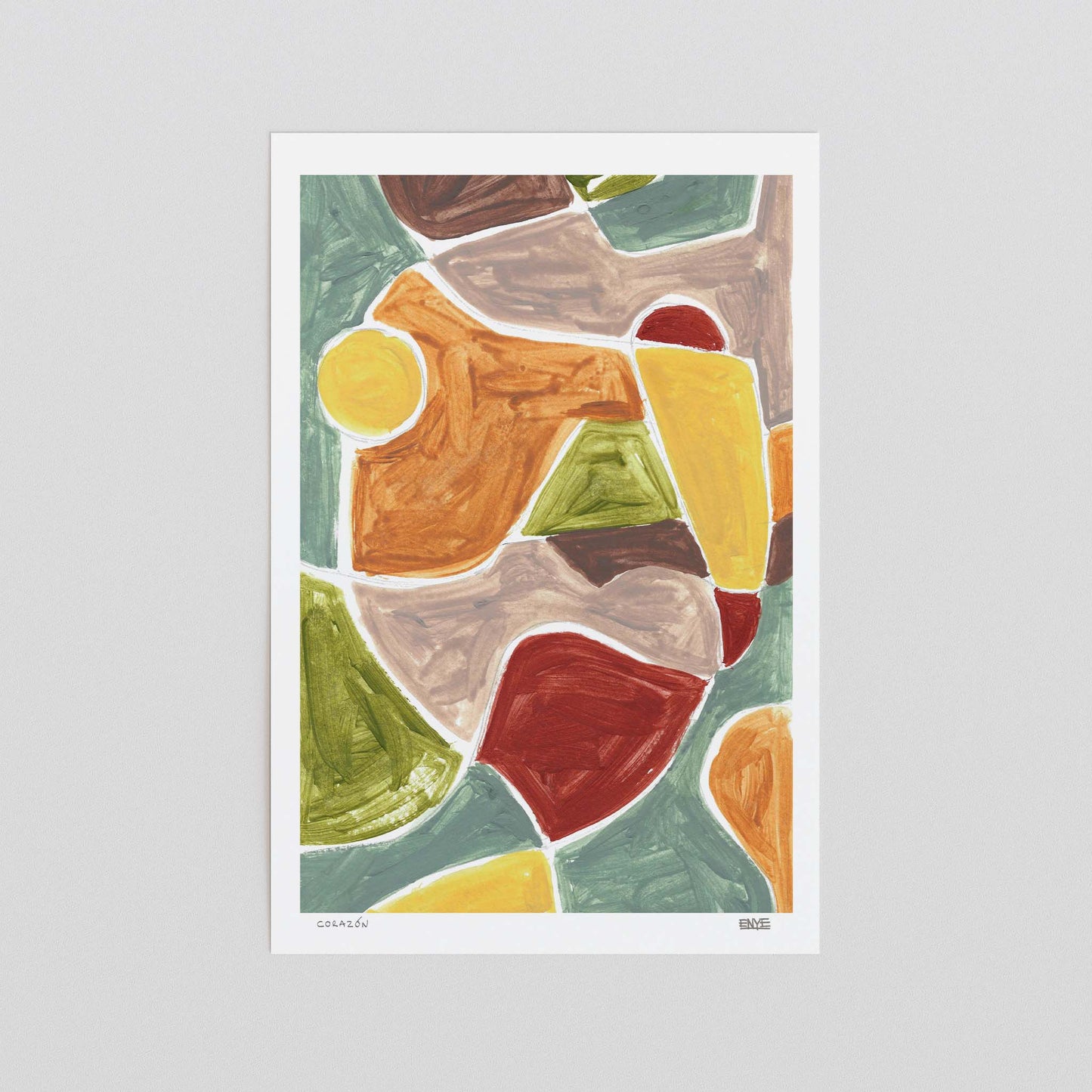 The natural colours in this piece of abstract wall art make it well-suited to earthy and warm interiors. At the smaller size of (12in x 18in), Corazón is a particularly versatile art print if you love styling your art on shelves in a larger gallery wall layout.