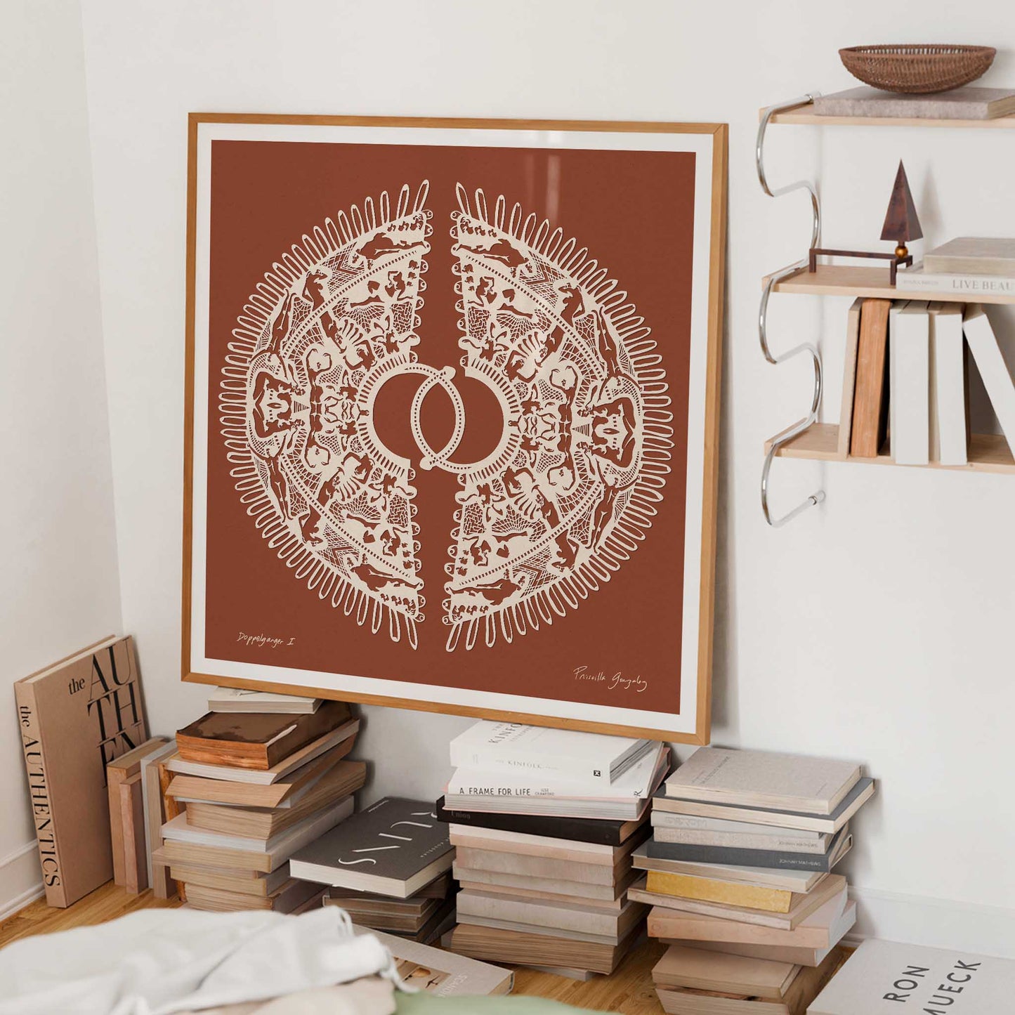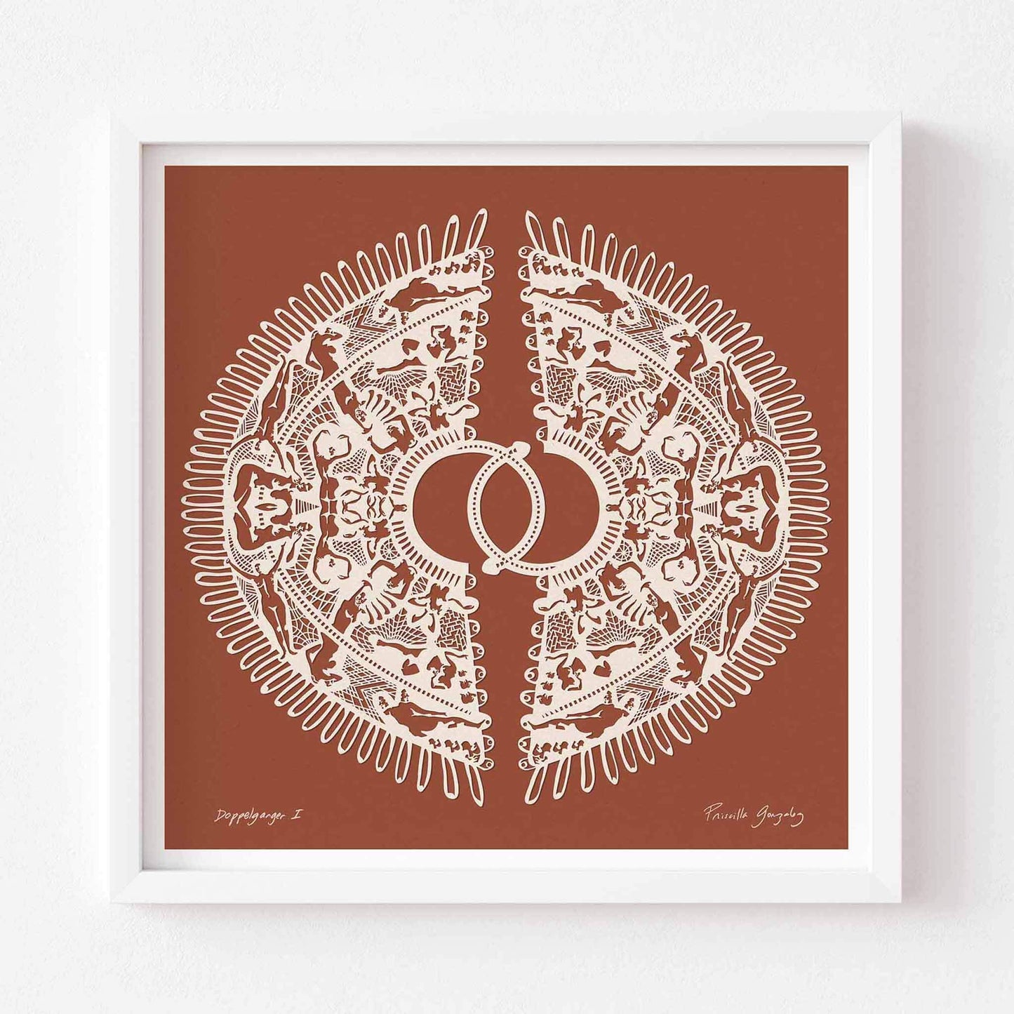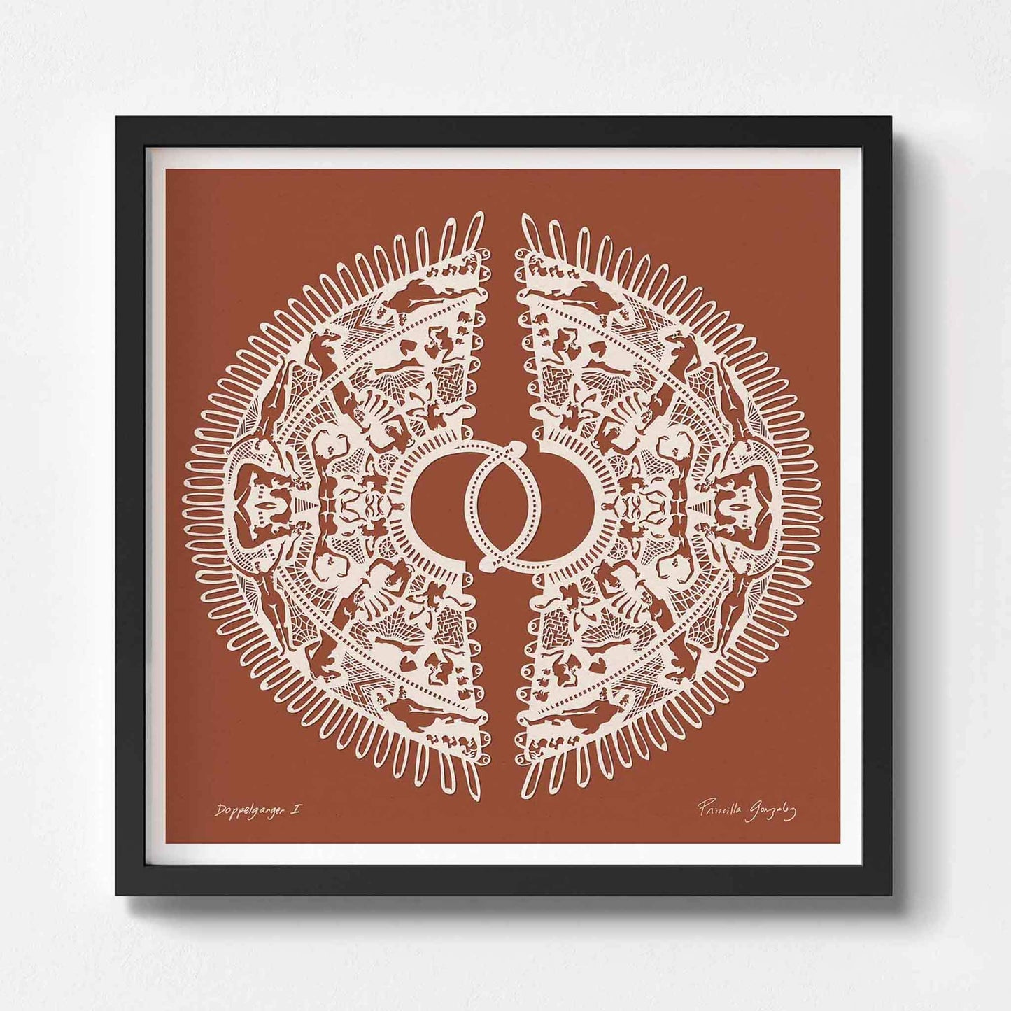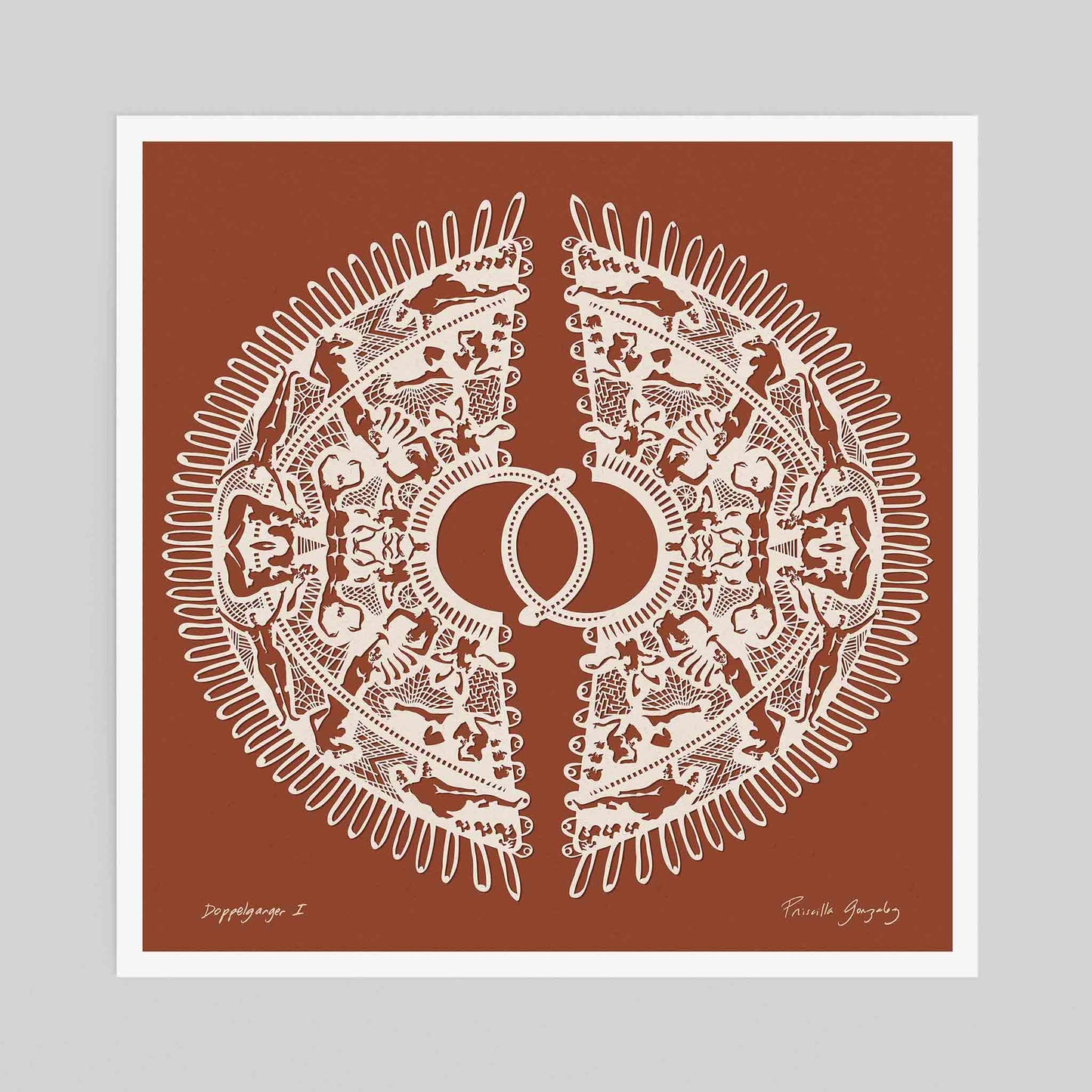 Priscilla González's large square art print Doppelganger 1 is truly unique. A closer look reveals female figures woven into a symmetrical layout inspired by pre-Columbian jewellery from South America. Elegant silhouettes of the female form fill this intimate and feminine design for Priscilla’s papercut works.