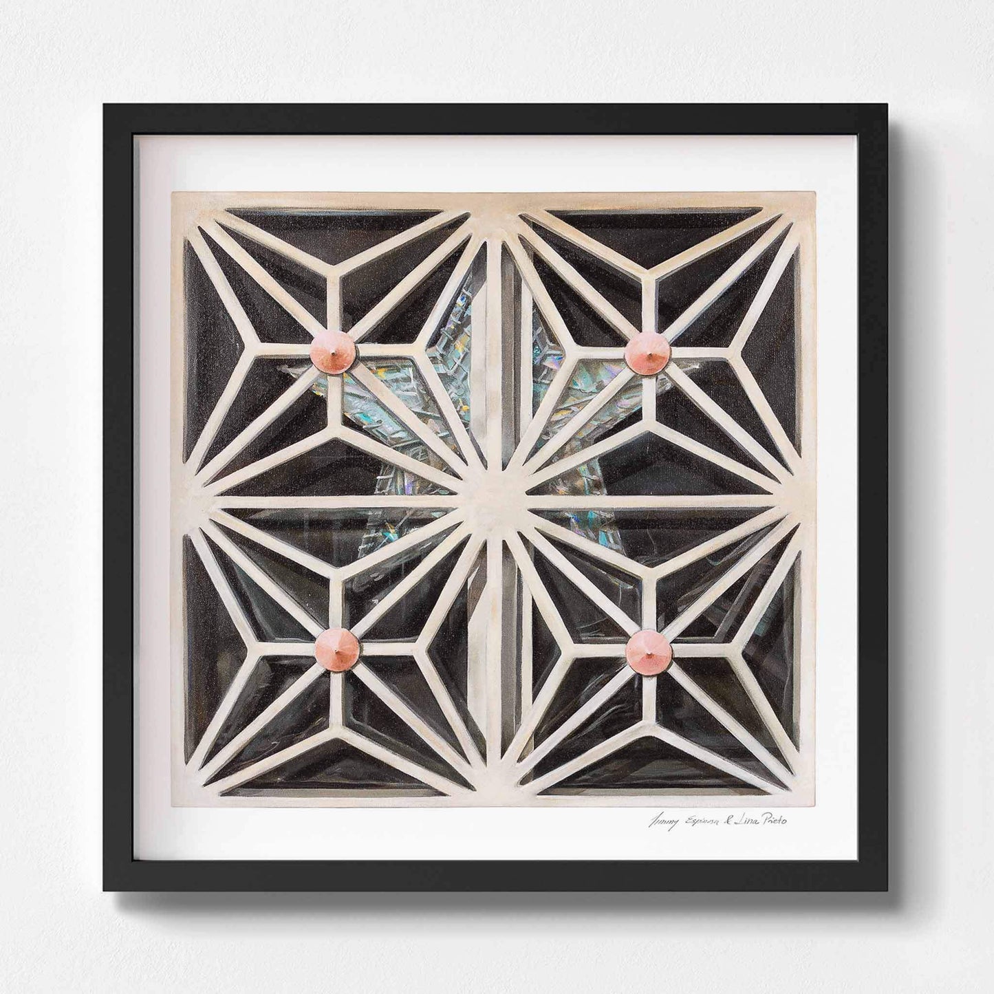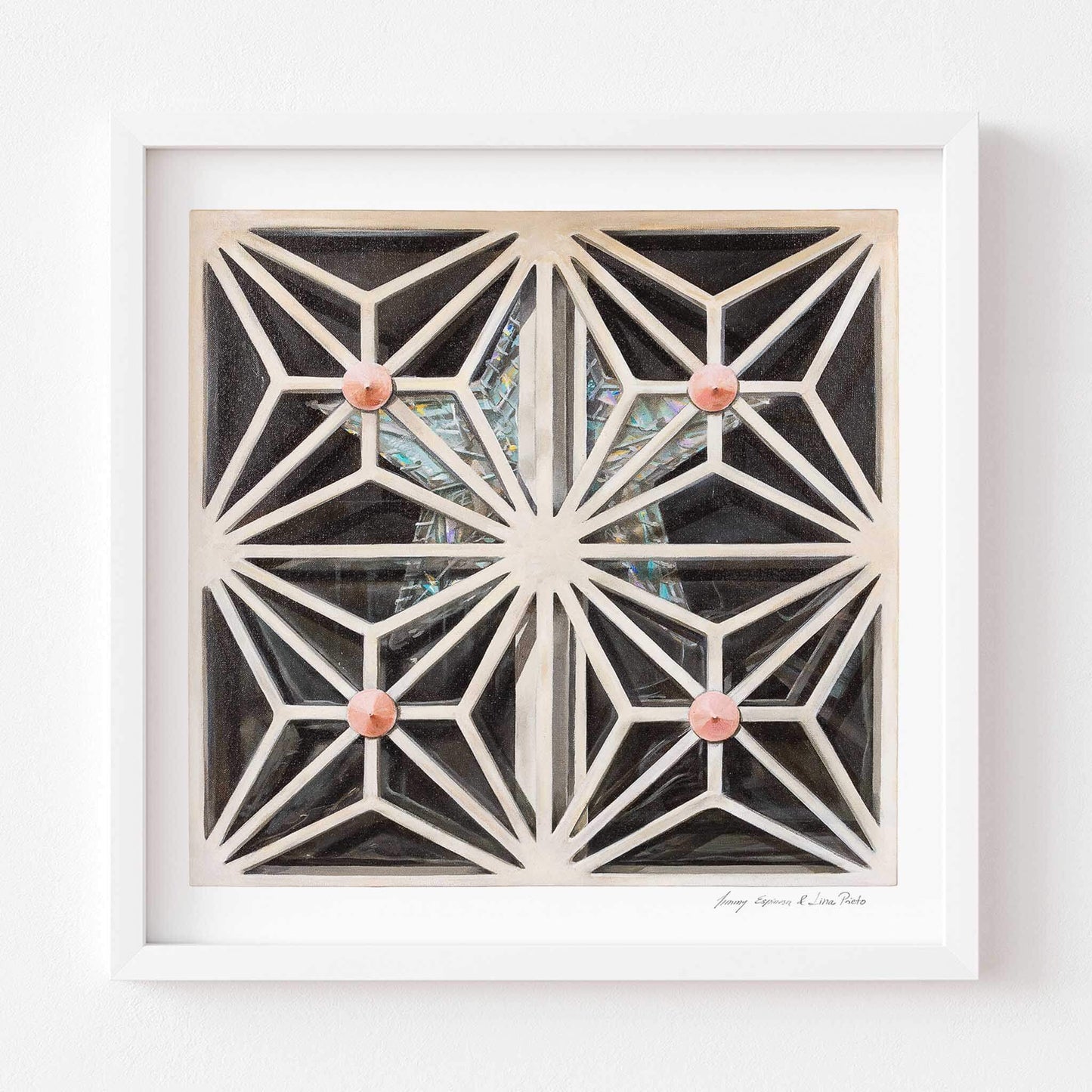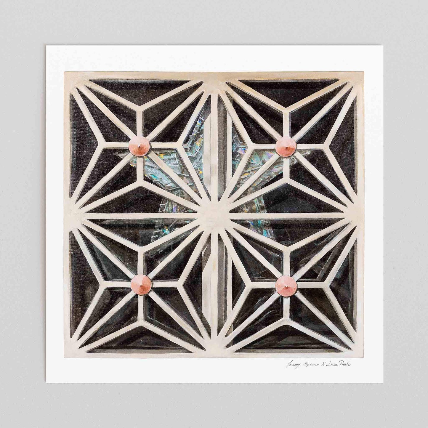 The subdued tones in this square art print allow the geometric design of the window grille to stand out. The Christmas star hidden behind the grille is a reminder of family, celebrations and festivities; times shared with loved ones.