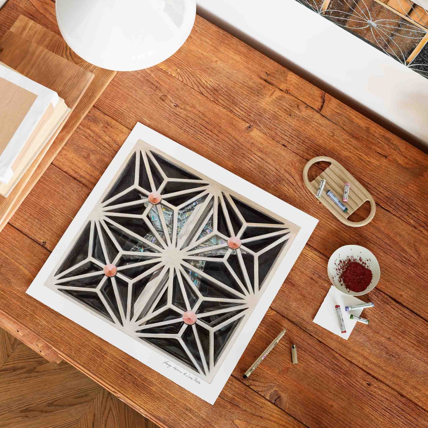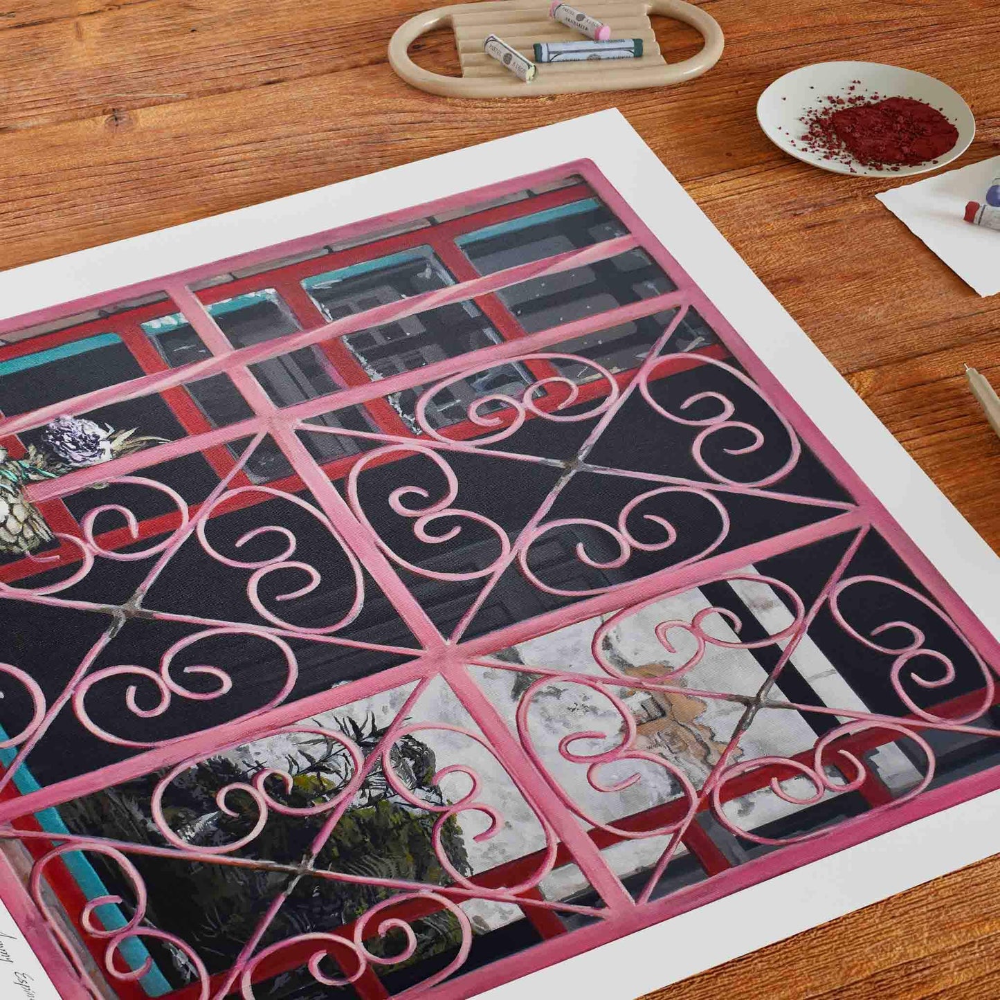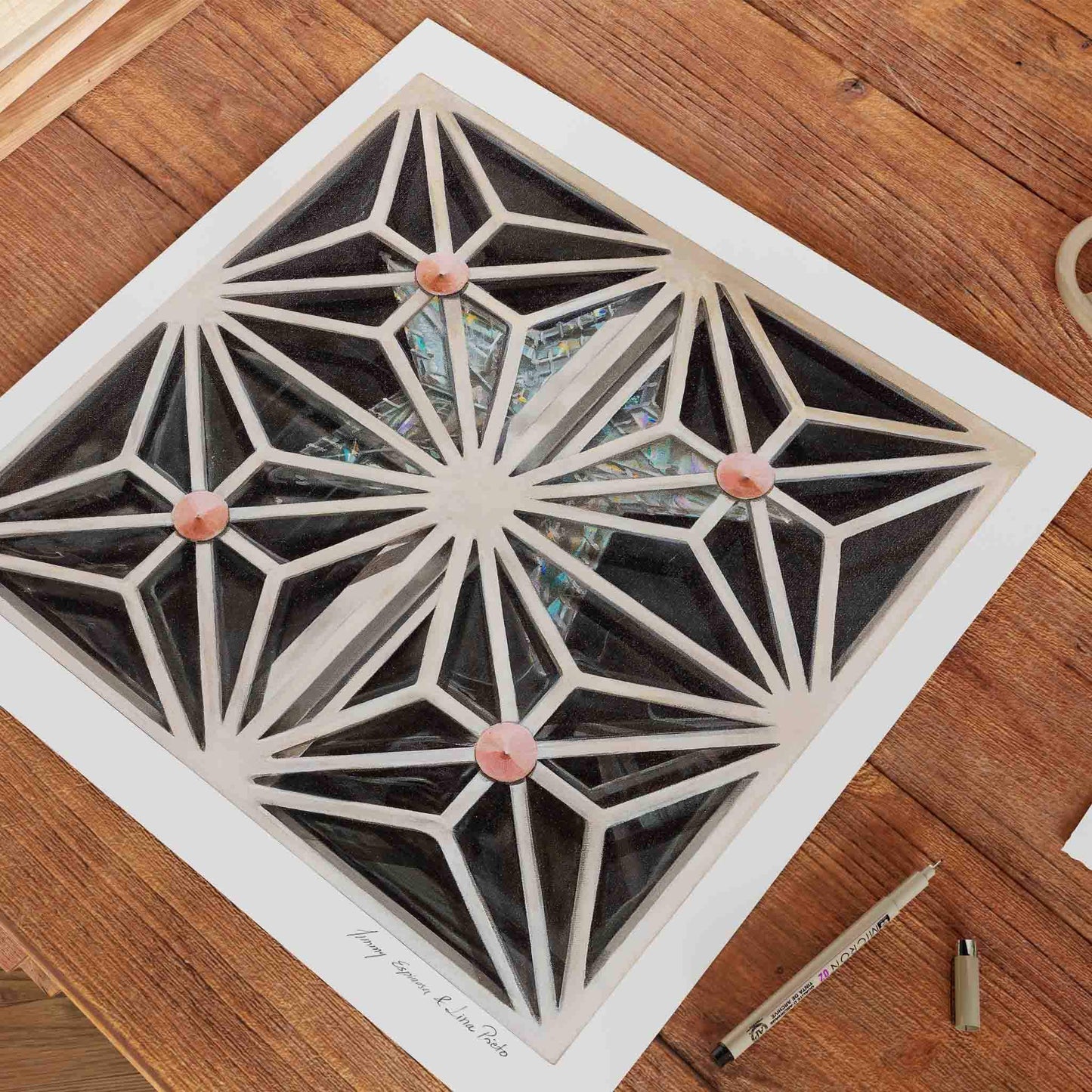 The subdued tones in this square art print allow the geometric design of the window grille to stand out. The Christmas star hidden behind the grille is a reminder of family, celebrations and festivities; times shared with loved ones.